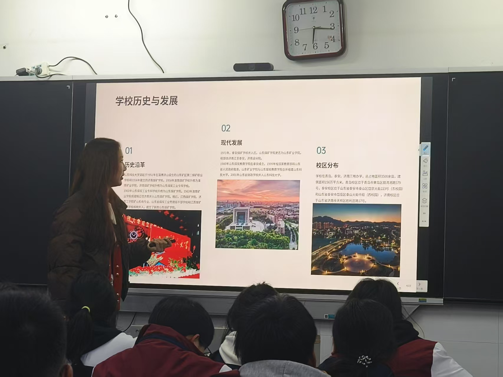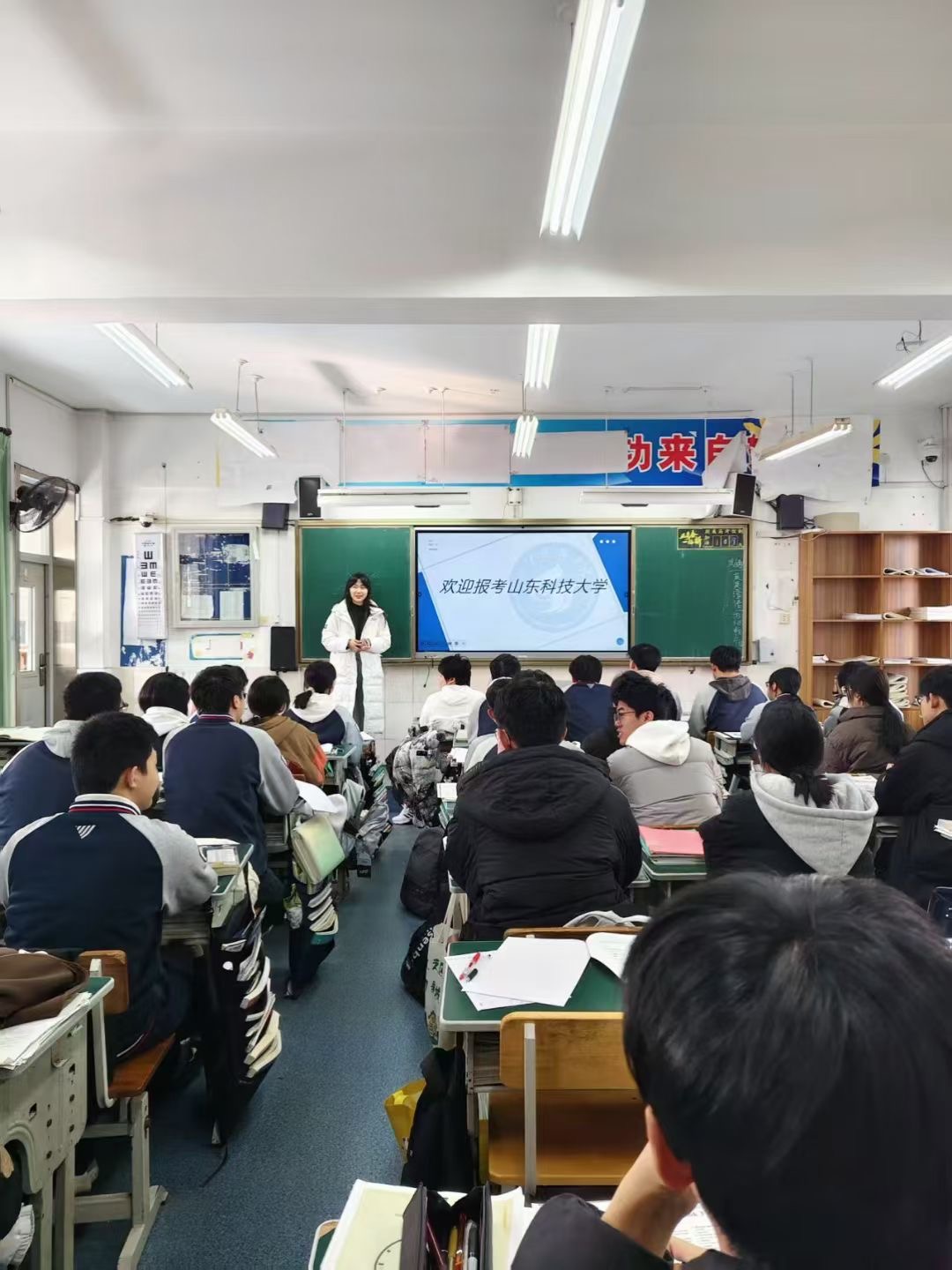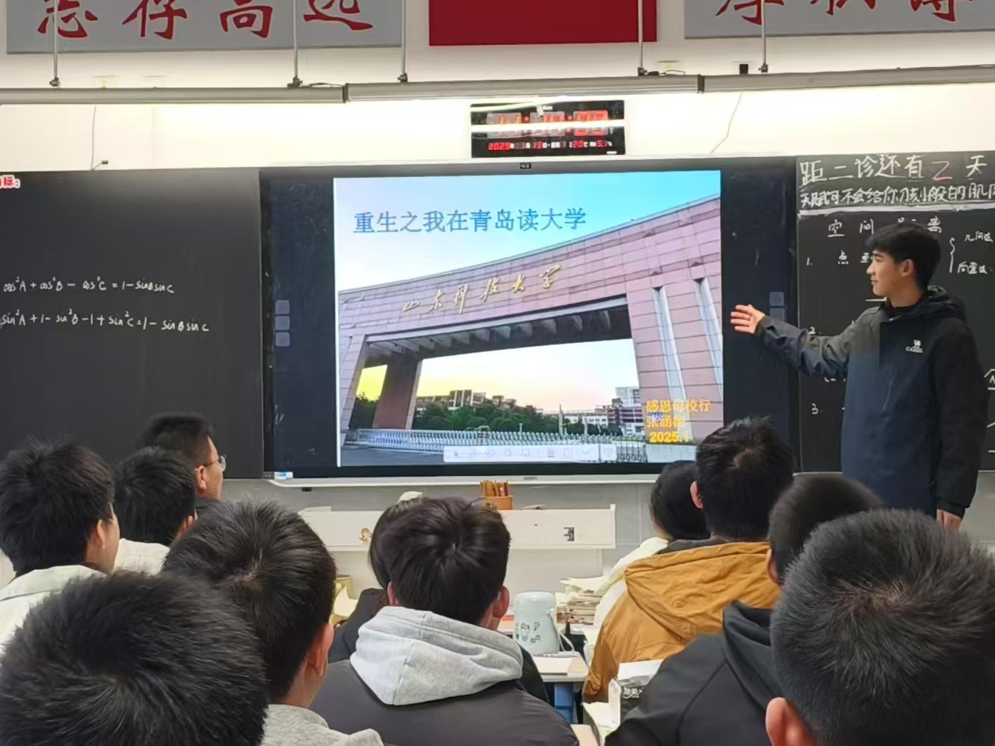 活动中,学子们身着山科大文化衫,重返承载青春记忆的母校课堂。在兖州一中,智慧交通2023-2班胡慎铎在高三教室黑板上写下“追光而行,终将光芒万丈”,并深情回忆高中数学老师李瑞的教诲:“老师的严谨治学让我学会坚持,如今我也希望将这份力量传递给更多人。”威海二中宣讲现场,智慧交通2024-1班赵欣雅通过精心制作的PPT,展示了山科大优美的校园风光与交通学院的无人机实验室、智能交通实训基地等实验基础,引得学弟学妹赞叹连连。