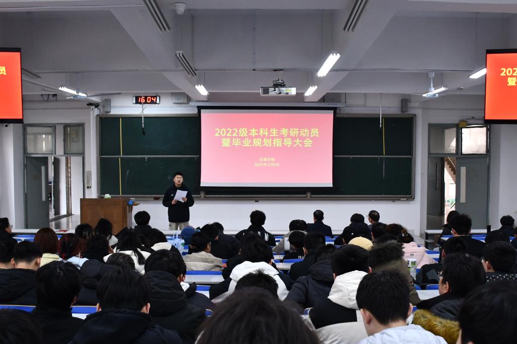 为帮助2022级本科生准确把握当前考研与就业形势,做好职业发展规划,激发同学们的考研热情,交通学院在J14-221召开2022级本科生考研动员暨职业规划指导大会。交通学院院长辛嵩、学工办主任(团委书记)刘倩婧、教师代表赵子亮、靳露、辅导员徐昊昊及2022级全体本科生参加,会议由2022级辅导员曹泽宇主持。