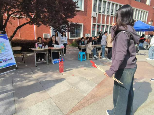 “趣味竞技”环节现场氛围热烈,设置掰手腕与投壶两大游戏。掰手腕比赛中,选手们奋力较量,围观同学的加油声此起彼伏;投壶活动现场,参与者屏气凝神、精准投掷。紧张刺激的竞技不仅释放了学习压力,更增进了同学间的默契与情谊。完成前两环节的同学可章兑换小零食,在“甜蜜收获”环节感受暖心惊喜。