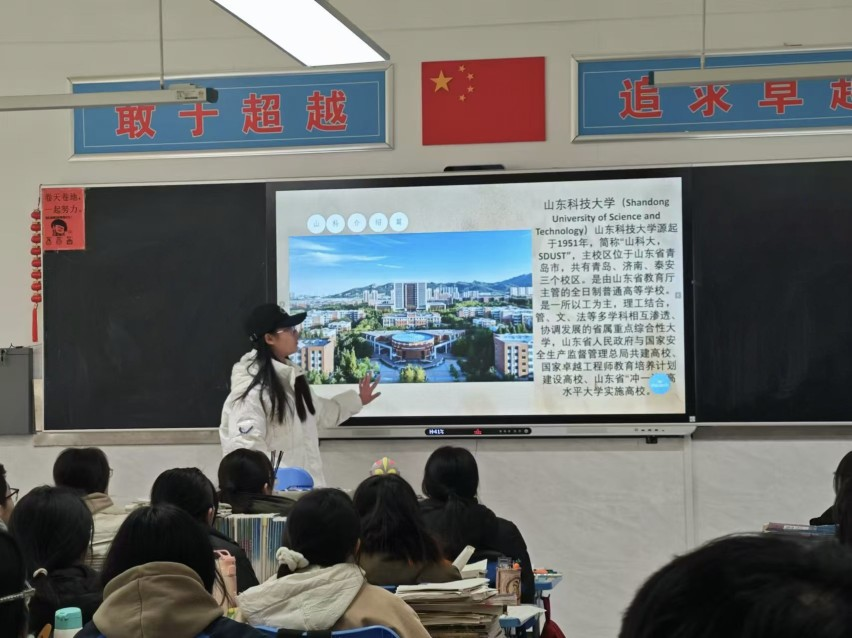 法学24级1班的王璐瑶,踏着新学期的晨曦,走进了山东省邹城市孟子湖中学。在晚自习的静谧时光里,她化身为山科的使者,不仅细数学校的王牌专业与办学特色,让同学们对山科的专业设置有了初步了解,更通过生动的“云游”体验,让高一的学弟学妹们仿佛置身于山科的校园。作为刚经历高考的“过来人”,王璐瑶分享了自己的学习经验和感悟,解答了学弟学妹们的疑问,也满足了他们对大学生活的美好期待。