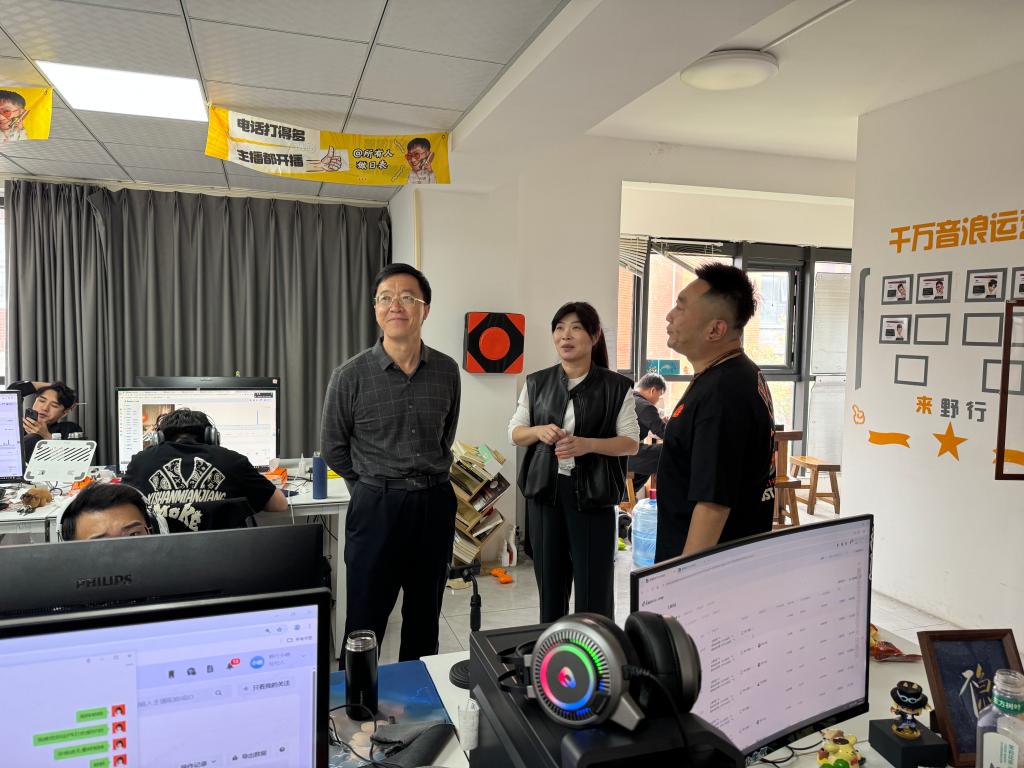 在青岛野行文化传媒有限公司,王斌一行参观了直播运营中心和短视频创作基地,了解企业在主播孵化、电商直播、知识付费等领域的运营模式。公司运营总监大聪介绍,企业作为抖音头部公会,已孵化10000+签约达人,单月流水突破2000万元,并积极探索“直播+文创”新业态。