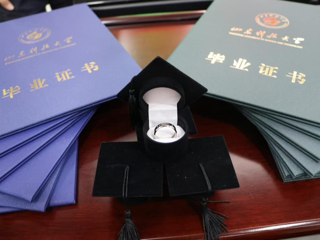 仪式环节庄重而感人。欢送会伊始,一段精心剪辑的毕业回顾视频,串联起了大学四年生活,带大家重温了大学时光的精彩点滴,现场弥漫着温馨与不舍的暖流。班级点名环节,同学们一声声饱含深情的口号,既既满载着对青春岁月的无限眷恋,更是掷地有声地许下未来必将不负师恩、为院争光的郑重承诺。学院领导老师们为毕业生颁发毕业证书,并为他们赠予象征母校深厚情谊与艺术传承的毕业纪念戒指,戒指外圈刻有学校和学院logo、内圈刻有每位同学姓名和学号。手捧毕业证书与纪念戒指,喜悦与自豪洋溢在每位毕业生的脸上,现场掌声经久不息。学院特别为应征入伍与赴西部就业的同学佩戴大红花,表彰他们胸怀家国、甘于奉献的精神,场面庄重而感人。最后,多位老师和同学一起为毕业生献唱毕业歌曲。深情的歌声中,不少毕业生轻声跟唱,离别之情弥漫会场。会后,全体毕业生来到学院定制的毕业展板前,留下最后的纪念照片,并邀请老师在学士服和毕业文化衫上签名留念。