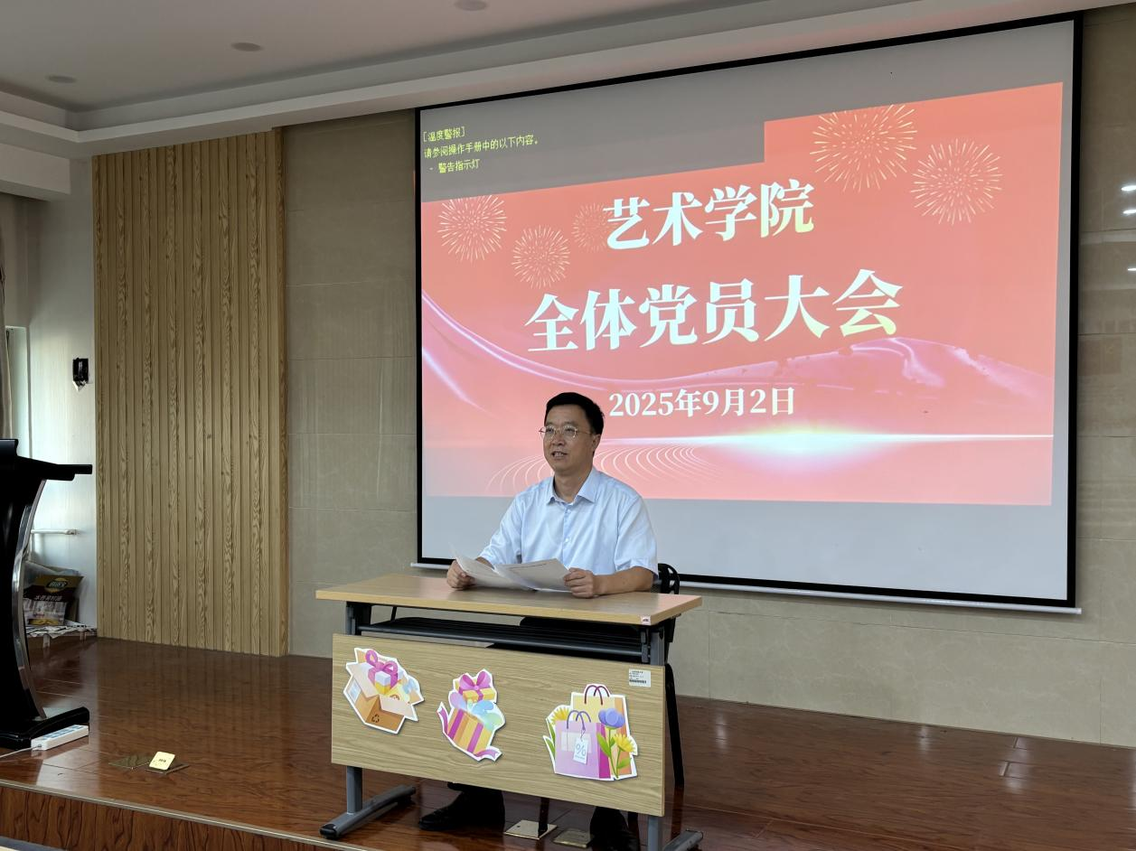 9月2日,艺术学院召开党员大会暨新学期全体教职工会议,学习传达学校2025年领导干部暑期读书班会议精神,认真总结学院2025年上半年各项工作,统筹谋划新学期各项工作,为完成学院年度目标任务进一步统一思想、凝心聚力、加油鼓劲。会议由学院党委书记王斌主持。
