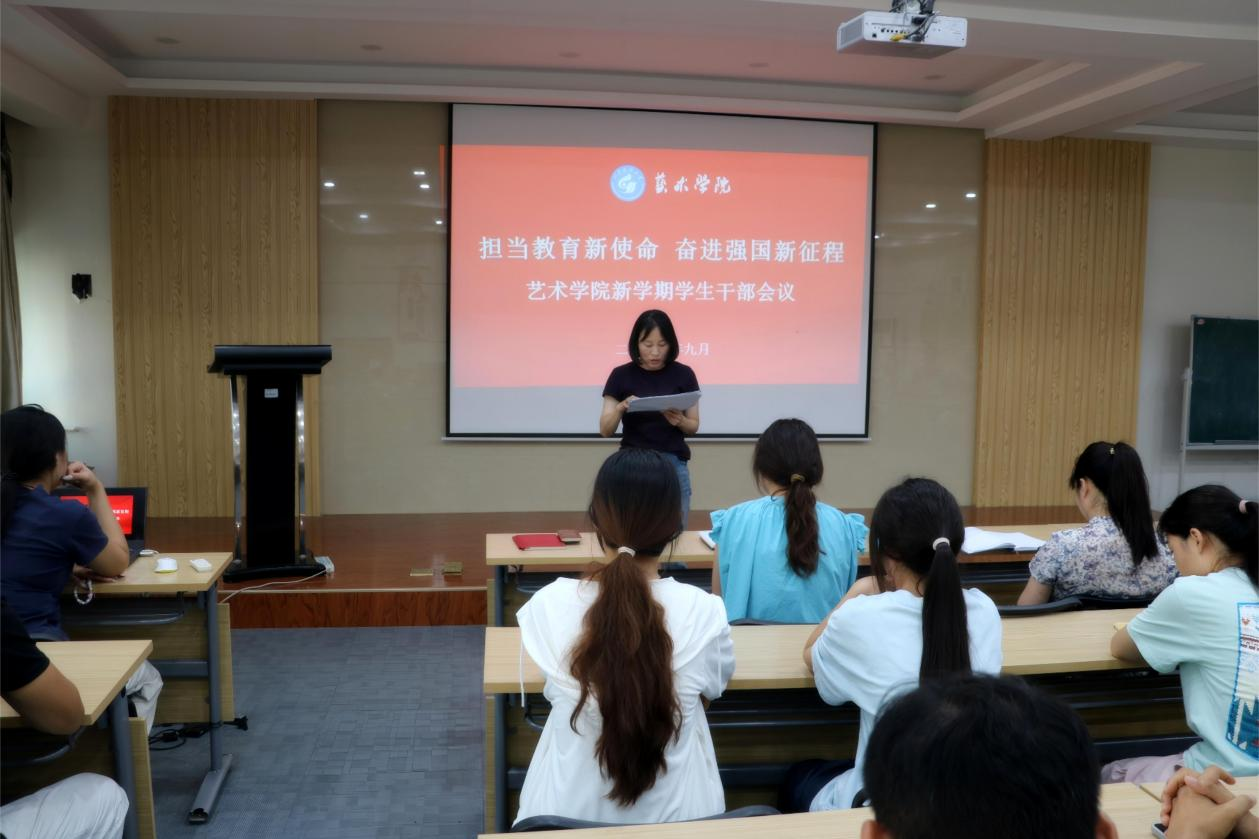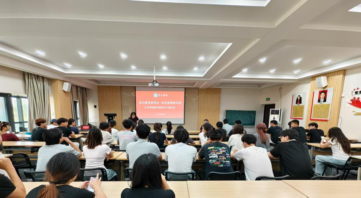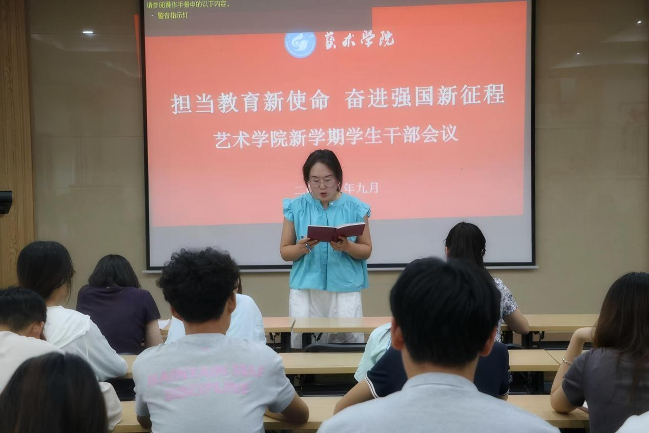 9月1日,艺术学院于J9-433会议室召开新学期开学第一课。学院党委副书记兼副院长卫雪、全体专兼职辅导员出席会议,全体学生干部参会。会议由学工办主任(团委书记)牟杰主持。