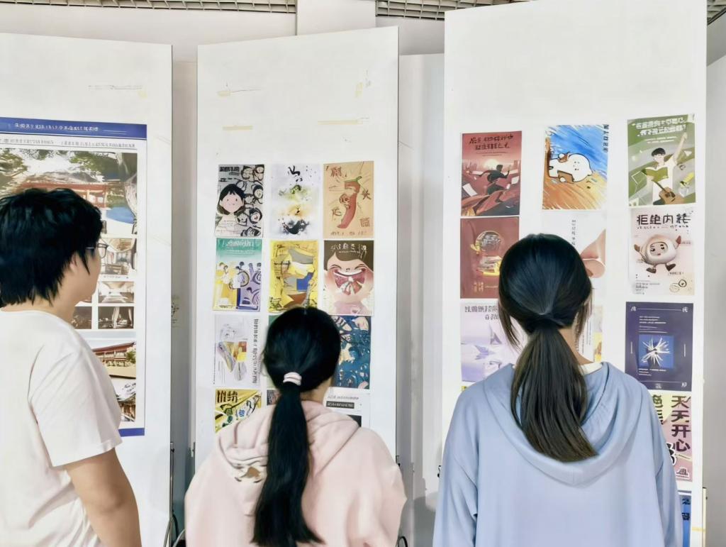活动覆盖艺术学院全体学生,历经作品征集、现场展览、互动评选等环节,以艺术为纽带,传递“用艺术疗愈心灵”的理念,为校园心理文化注入鲜活力量。展厅内,一幅幅色彩鲜明的海报有序陈列,吸引众多学生驻足观展。活动特设“互动区”,观者可领取便利贴,写下对作品的情绪共鸣并粘贴在留言板上,“这幅画的蓝色调让我想起刚入学时的不安,太有代入感了”“暖黄色的构图充满希望,仿佛看到了努力备考的自己”…… 一句句真挚的留言,让不同年级学生的情绪得以连接。工作人员全程引导观展秩序,解答“色彩情绪解读”相关疑问,并记录展场精彩瞬间。
