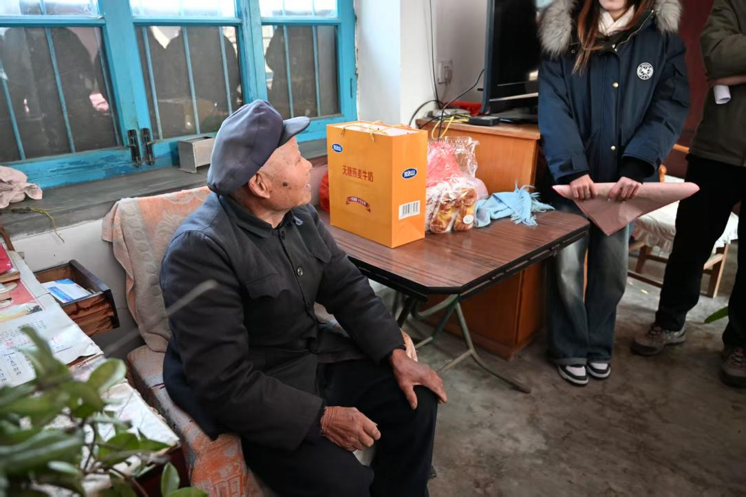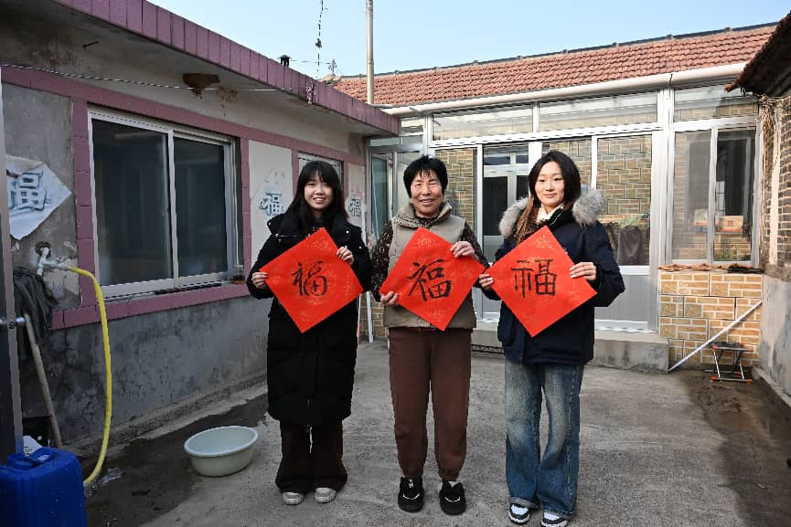 针对高龄、独居老人行动不便的情况,实践队组织队员分组上门,带着手写福字慰问老人,与老人促膝长谈,细致询问饮食起居、身体状况等生活近况,讲解新春习俗,驱散老人独居的孤单,让老人们在寒冬中感受到浓浓的节日暖意与关怀,让福字成为连接志愿者与村民的温情纽带。