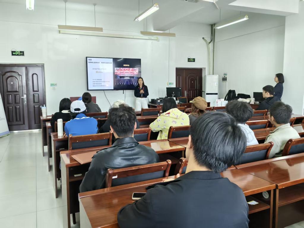 会上,华为慧通代表介绍了企业发展布局与人才需求,表达了深化合作的意愿。随后,企业设计部门负责人结合真实案例,分享了科技与艺术融合的设计实践及人才能力要求;HR负责人解读了相关岗位的招聘要求、薪资福利与校招政策,为学生职业规划提供思路。互动环节中,师生与嘉宾围绕实习岗位对接、职业发展规划、行业就业趋势等问题深入交流,现场氛围热烈。