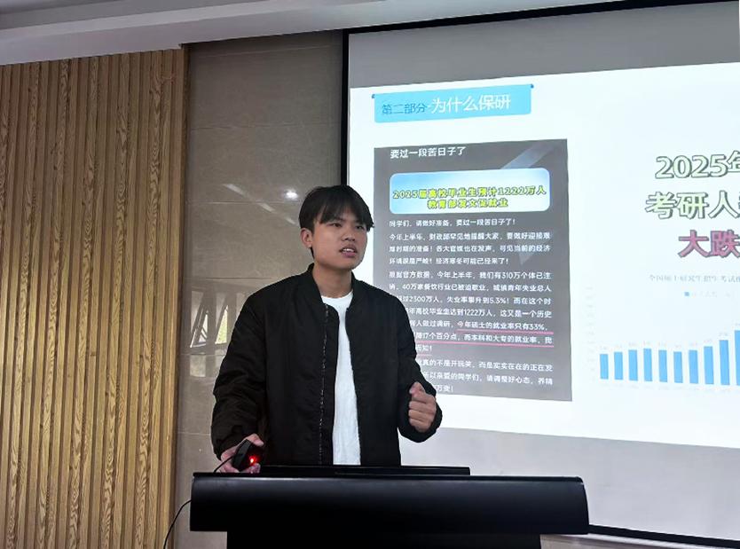 首先由王晨分享考研经历,他着重强调了打破信息差的重要性,提醒同学们不能埋头苦学,要积极主动地去搜集考研相关信息,例如院校招生政策的变化、专业课程的调整等。同时,他还以自身经历为例,鼓励同学们拒绝焦虑,保持良好的心态。随后,司海港围绕自身的推免经历展开分享。他先阐述了推免优势,并详细说明了推免流程,涵盖本科成绩要求、科研竞赛加分等方面,鼓励同学们从课程学习、竞赛参与等方面积极筹备,解答同学们在推免过程中的疑问。金俐怜分享英语四级经验。她剖析四级题型与高中考试差异,点明各题型答题要点,分享词汇分类记忆与碎片化背诵技巧,倡导考前多次模拟并分析总结,助力四级备考。最后,王克琼补充分享四级学习细节与技巧。他提出听力边听边做,合理规划做题时间,介绍精听、泛听等听力练习方法,帮助同学们更好地备战四级,规划学业提升路径。