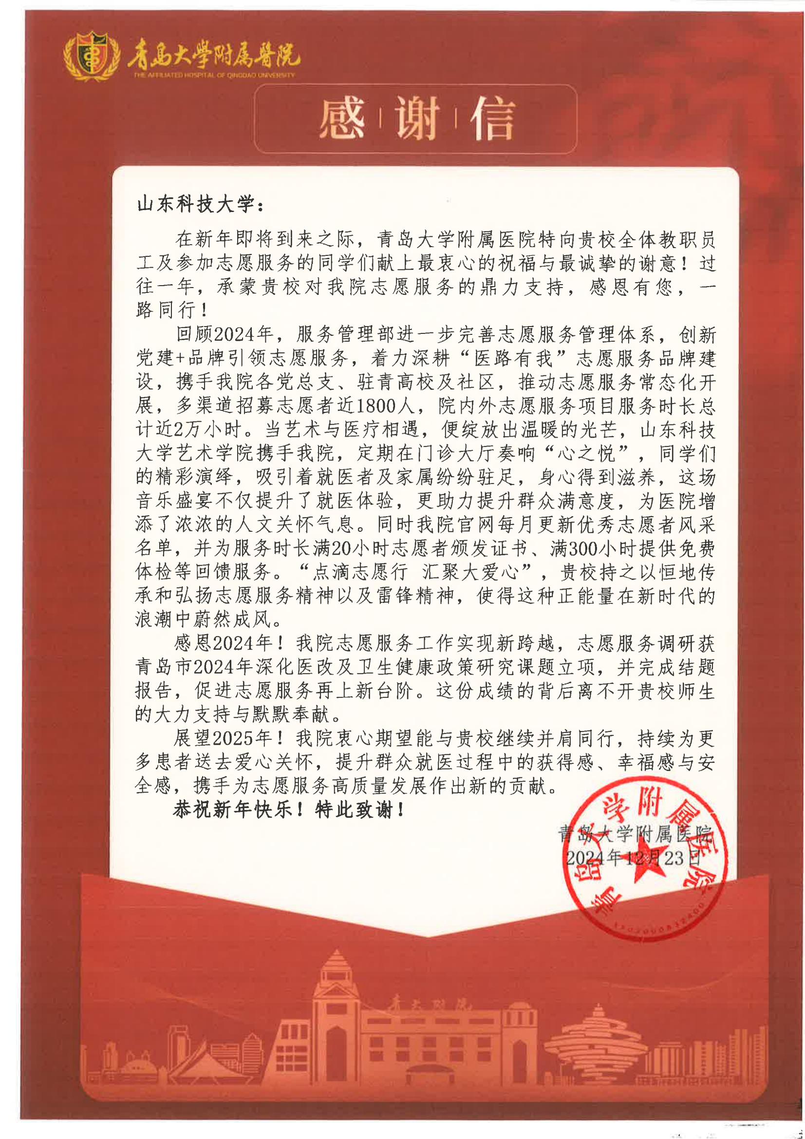 青岛大学附属医院向我校发来感谢信