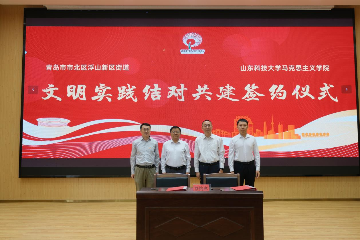 仪式上,市北区委宣传部、浮山新区街道与学院分别签署《新时代文明实践结对共建协议书》。学院在市北区新时代文明实践中心设立教育实践基地,双方将在打造基层理论传播高地、建强思政实践育人平台、孵化文明实践品牌项目等方面深度合作。同时,学院在浮山新区街道设立校外课堂,充分发挥街道在组织、载体和活动方面的优势,为学院师生开展调查研究、岗位锻炼、社会实践等提供支持,推动党的创新理论大众化传播。