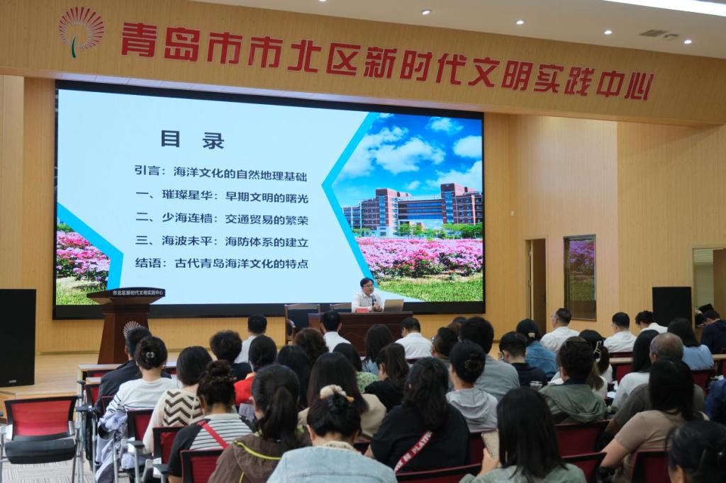 签约仪式后,市北区新时代文化书院大讲堂正式开讲。学院副教授宋开金围绕“向海而生:古代青岛海洋文化漫谈”主题,带来一堂精彩纷呈、深入浅出的文化课程,让居民们在家门口享受“高校定制”的文化盛宴。