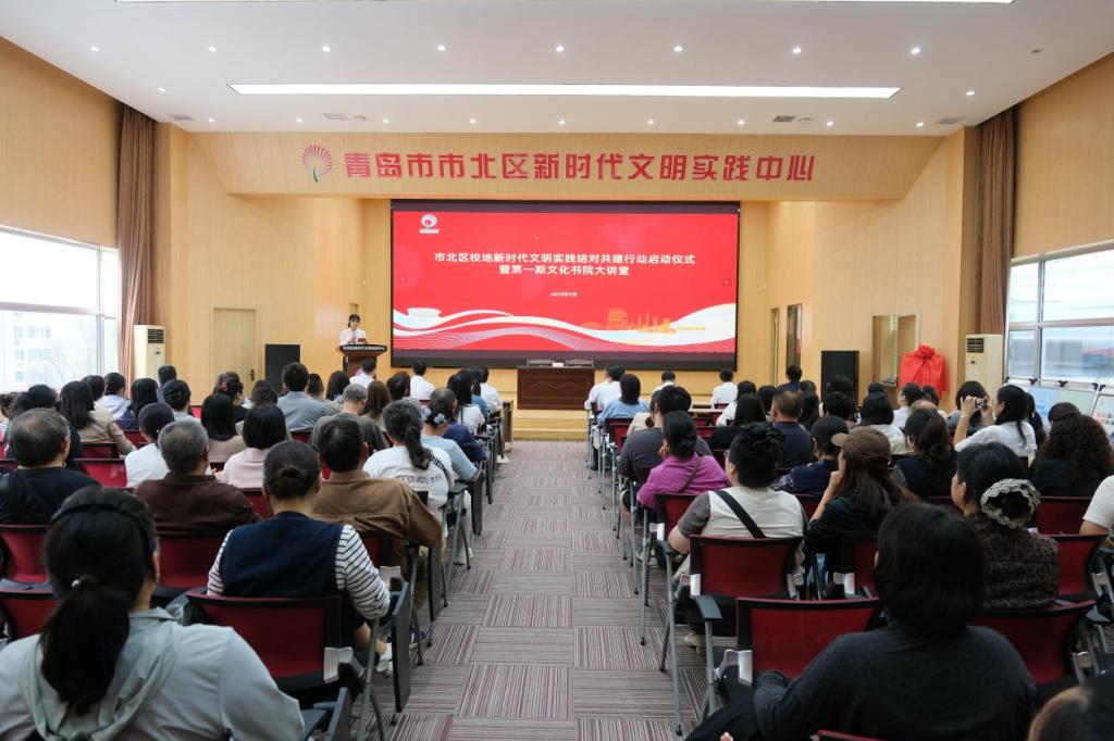 9月24日,学院与青岛市市北区校地新时代文明实践结对共建行动启动仪式暨第一期文化书院大讲堂在市北区新时代文明实践中心举办。市北区委宣传部、浮山新区街道、马克思主义学院等相关领导,各街道、社区文明实践专管员以及居民代表、媒体代表共150余人参加。