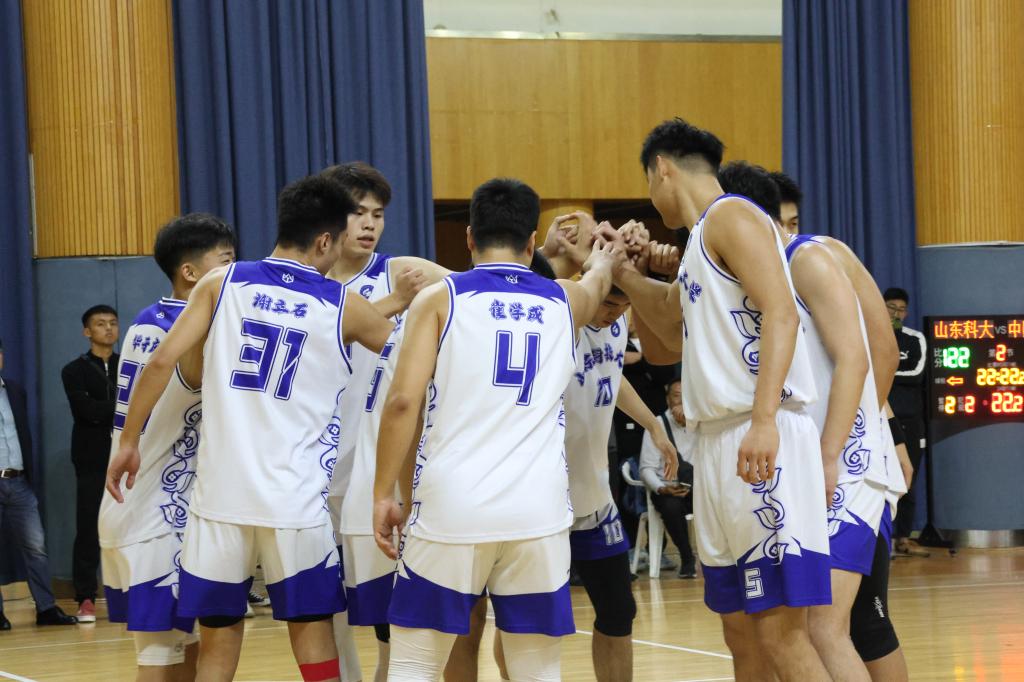 我校高水平男篮与山东大学、中国海洋大学、烟台大学、潍坊学院、恒星学院分在一个小组。学校男篮在比赛中先后战胜潍坊学院、恒星学院、烟台大学和山东大学;小组赛最后一场遭遇强敌中国海洋大学,双方均打出高质量攻防,最终学校男篮87:90惜败,获得了小组第二名。