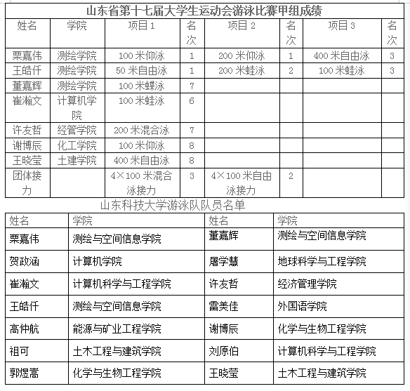 我校由田启发任领队,赵鹏、李真2名教练员和14名运动员组成的代表队参加了甲组的比赛.勇夺3枚金牌、2枚银牌、3枚铜牌,荣获男子甲组团体总分第三名,并荣获“体育道德风尚奖”。栗嘉伟获男子甲组100米仰泳、200米仰泳双料冠军及男子甲组400米自由泳铜牌;王皓仟获男子甲组50米自由泳冠军、200米蛙泳银牌及100米蛙泳铜牌;栗嘉伟、谢博辰、崔瀚文、王皓仟在男子甲组4×100米自由泳接力决赛中团结协作最终斩获银牌;栗嘉伟、崔瀚文、董嘉辉、王皓仟在男子甲组4×100米混合泳接力决赛中奋勇争先获得铜牌。