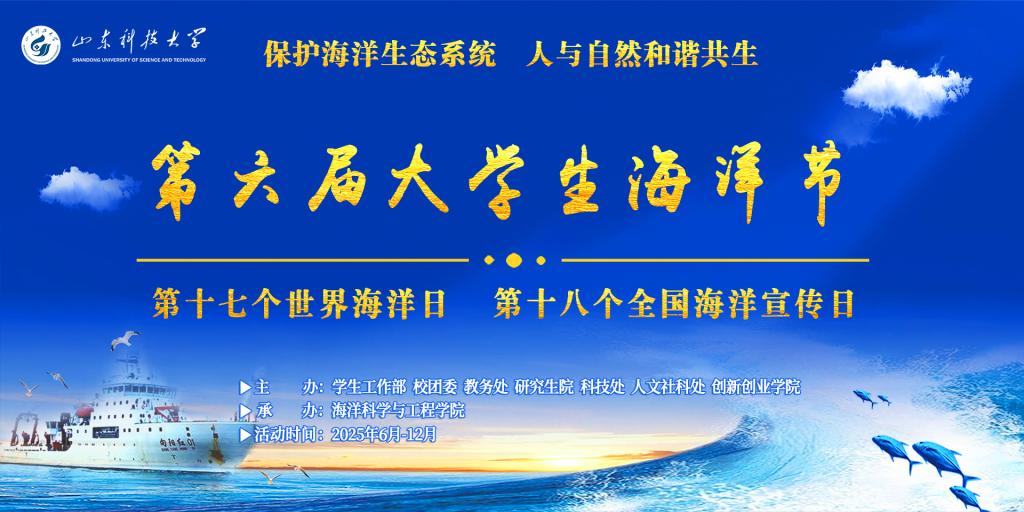 2025年6月8日,时逢第17个“世界海洋日”暨第18个“全国海洋宣传日”。为增强大学生对海洋资源、海洋环境、海洋科技、海洋开发等的认识,引导大学生认识海洋、关爱海洋、保护海洋,经研究决定,举办山东科技大学第六届大学生海洋节,现将有关事宜通知如下: