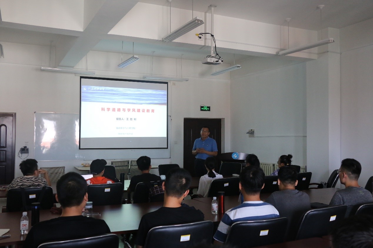 9月8日下午,海洋学院副院长王胜利为2020级研究生新生开展科学道德与学风建设教育,讲座中,王胜利针对考试作弊、学历造假、编造数据、论文抄袭、成果侵吞、骗取经费等科研学术活动中的不端行为,告诫同学们要保持严谨踏实的求学态度,杜绝不良风气,不要急于求成,戒骄戒躁,求真务实。同时,王老师分享了自己一路走来的励志经历,教育同学们在做学问的过程中要有目标,有追求,要敢于投入大量的时间和精力,唯有勤学笃行,方能成长成才。(通讯员:刘晨)
