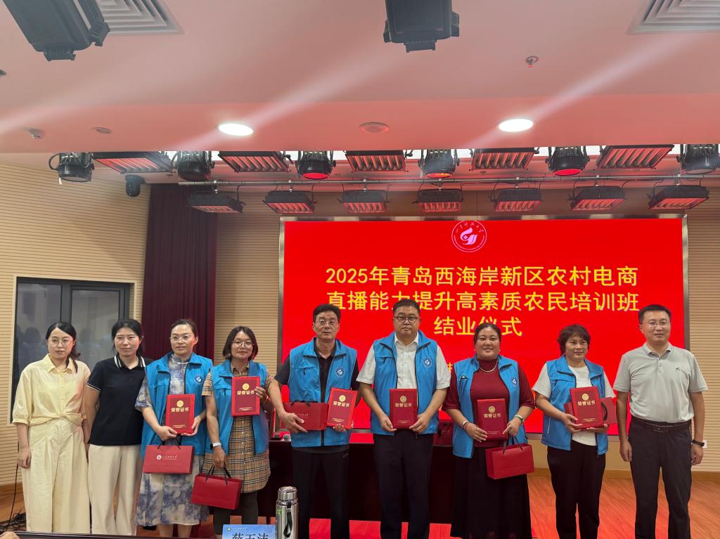 近日,由我校与青岛西海岸新区农业农村局联合举办的2025年青岛西海岸新区农村电商直播能力提升高素质农民培育培训班顺利结业。此次培训班线下课程为期8天,吸引了来自西海岸新区各镇街的种植大户、农业合作社成员等40名学员参加,旨在提升农民电商直播专业水平,助力农产品拓宽销售渠道,推动乡村振兴。