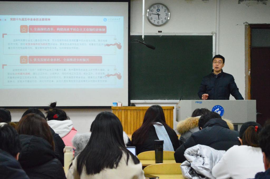 为全面把握和深入贯彻党的十九届五中全会精神,推动全会精神走深走心走实,12月14日下午5点,济南校区党工委委员、管委副主任兼党政办公室主任孙国强在3-201与国际经济与贸易2018-1班学生进行面对面交流,深入解读了党的第十九届五中全会精神。