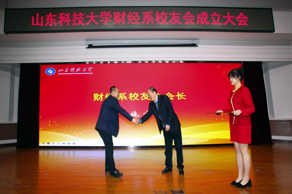大会审议通过了《山东科技大学财经系校友会章程(草案)》和财经系校友会理事会成员建议名单。贾长响等与会嘉宾分别向财经系校友会会长施宙授牌,向副会长代表、秘书长、副秘书长代表及理事代表颁发聘书,为校友代表颁发捐赠纪念牌。
