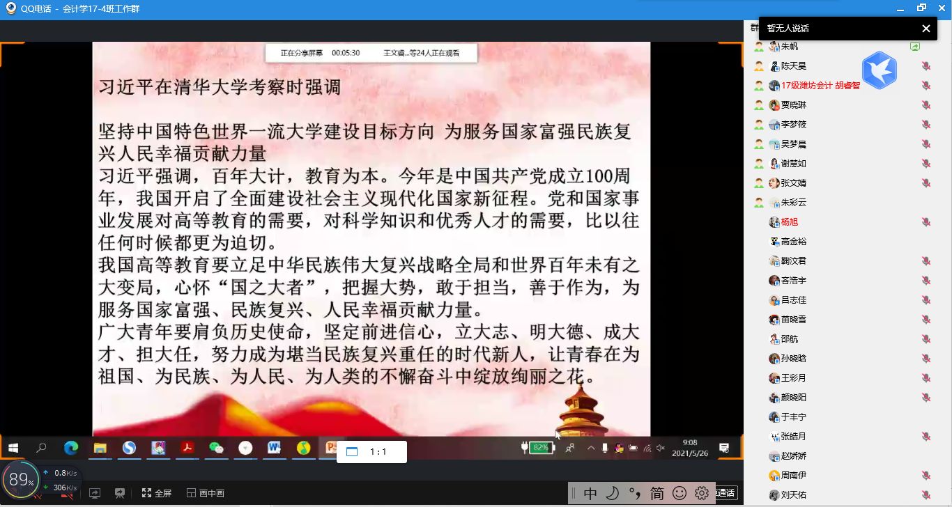 2017级开展线上主题团日活动,观看了习近平总书记在清华大学考察的相关视频。会计学2017-4班朱帆:“如今的我们和历史上任何时代的青年相比,都是幸运的。我们理应担当起青年的时代责任,立志成为建设祖国的战士,认真学习科学知识,努力锻造严谨务实品格,为实现中华民族伟大复兴而不断奋斗。”