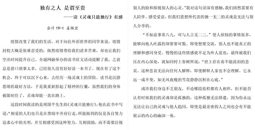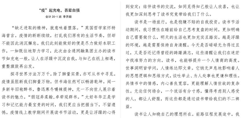 奇文共欣赏,疑义相与析,财经系组织学生共同阅读名著,每日分享读书心得,静心书写读书感悟,展现了财经系学生浓厚的阅读兴趣、细腻的文笔和深邃的思想。会计学2019-1班姜佩宏的《不忘来路,振兴国安》,写出了“须知少时凌云志,曾许人间第一流”的梦想;国际经济与贸易2019-3班郝雨的《以平凡著华章》,展现了“竹杖芒鞋轻胜马,谁怕?一蓑烟雨任平生”的心态;会计学2020-1班王腾禹的《邂逅书香,葳蕤年华》,表达了“路漫漫其修远兮,吾将上下而求索”的坚韧;会计学2020-1班李开颜的《“疫”起充电,吾辈自强》,体现了“将军百战穿金甲,不破楼兰终不还”的拼劲。
