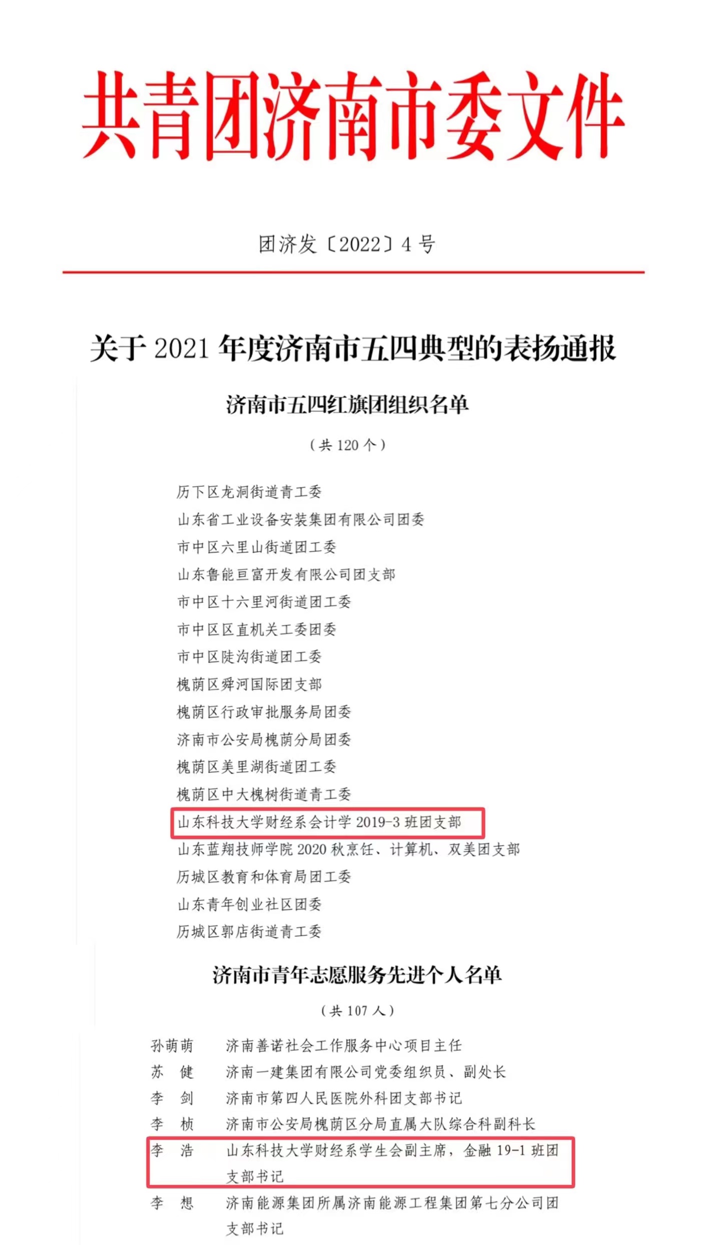 近日,共青团济南市委发布了《关于2021年度济南市五四典型的表扬通报》,财经系会计学2019-3班团支部获得“五四红旗团组织”荣誉称号,学生李浩获得“济南市青年志愿服务先进个人”荣誉称号。