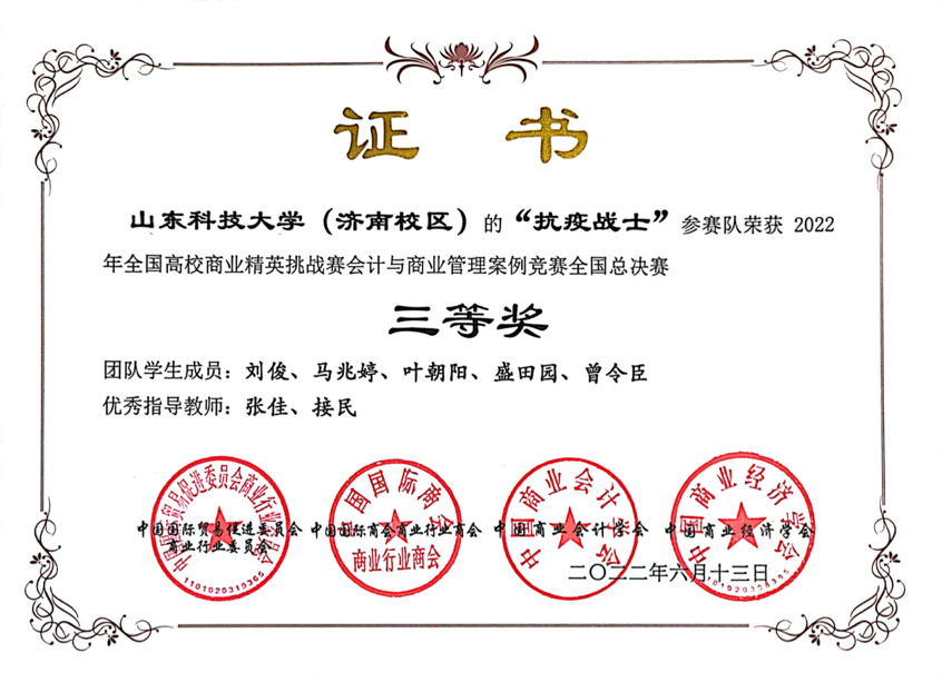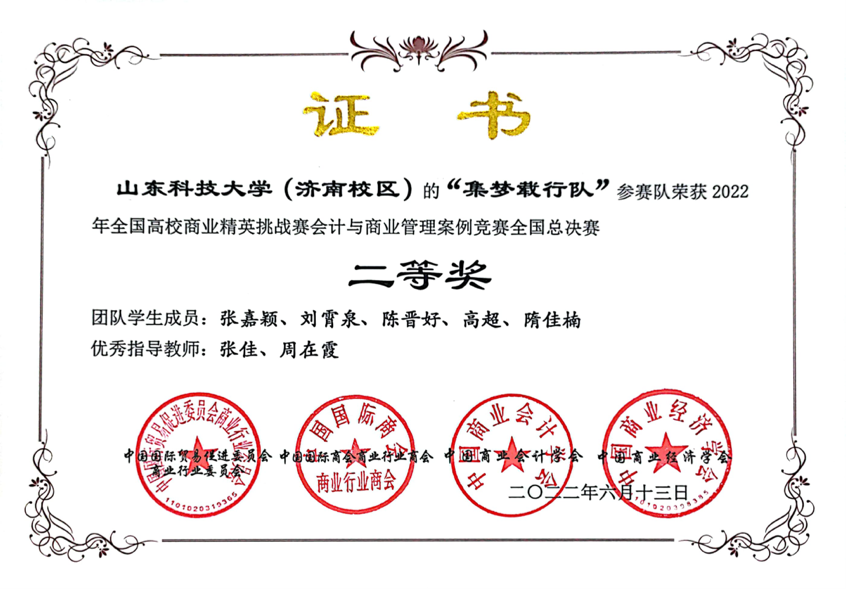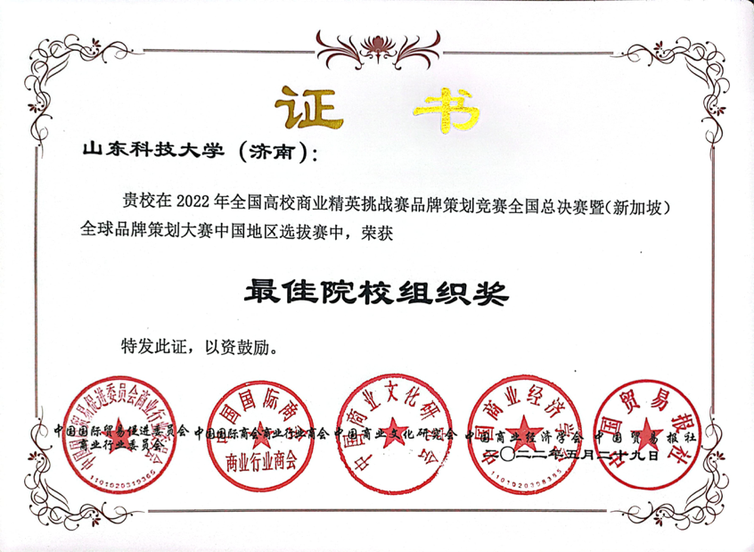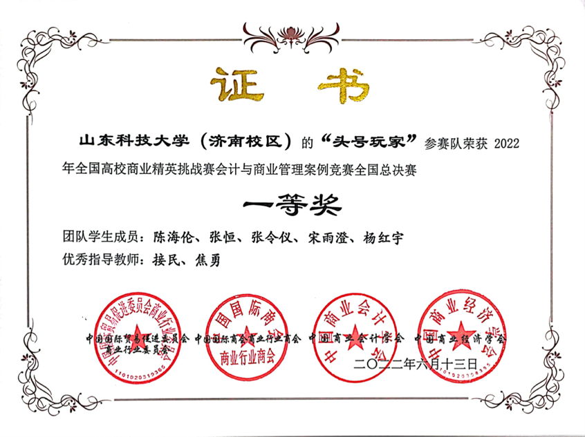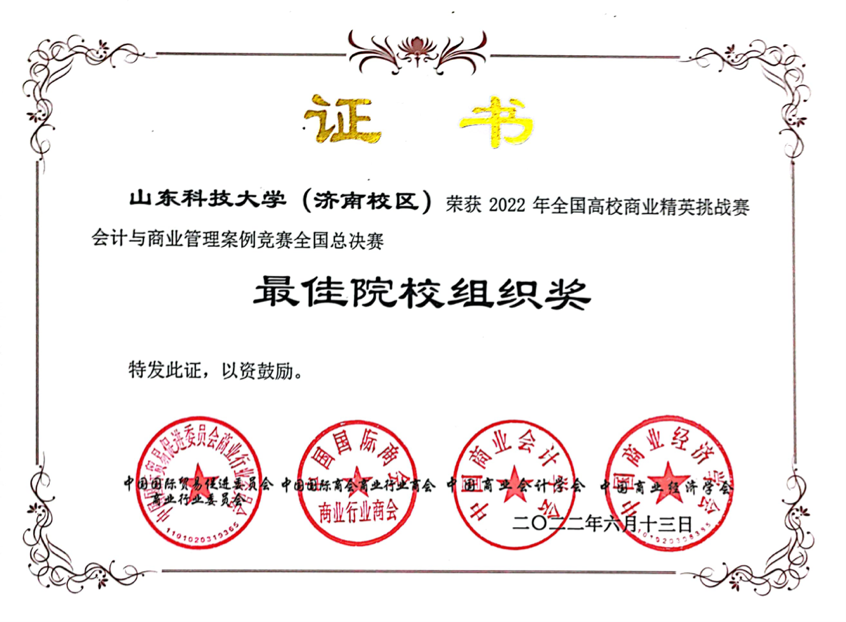 竞赛以线上答辩形式举行。在会计与商业管理案例国赛中,陈海伦、于慧、傅诚伟、郑凯锦、陈欣冉、何凝团队荣获一等奖,张嘉颖、薛子健、徐冰洁、官佳芮、张懿晨、曹婧团队荣获二等奖,刘俊、王若宏团队荣获三等奖。品牌策划国赛中,作品《药香浸润凌霄意,仁德华夏葆初心—同仁堂中医药品牌策划案》荣获一等奖,《轻松塑身,健康满分—基于“共禾之约•创意轻食”品牌策划》《比邻中文品牌策划案》《东方财富品牌策划案》等作品荣获二等奖,《广润五金机电品牌策划案》《山东鑫树林环境科技品牌策划案》《鹧鸪产销品牌策划案》等作品荣获三等奖。学校荣获全国总决赛最佳院校组织奖。