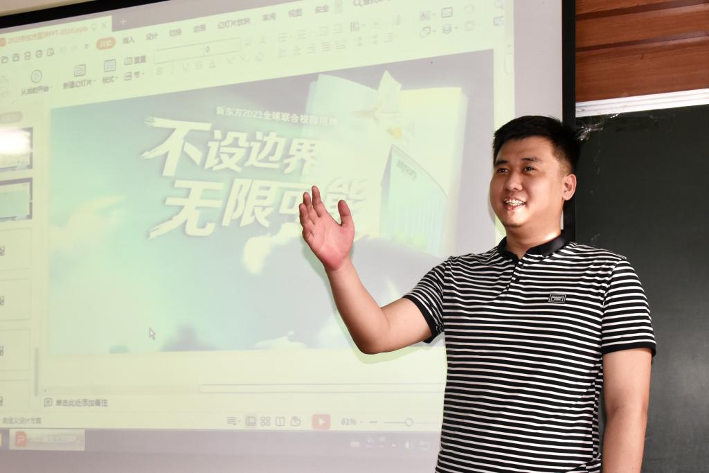 为促进毕业生高质量就业,将“走出去”与“请进来”相结合,拓宽毕业生就业渠道和就业岗位,落实2023 届高校毕业生春季促就业攻坚行动。5月16日,财经系于3-301教室举办“不设边界,无限可能”新东方教育科技集团山东省域学校专场招聘会。此次宣讲面向2023届应届毕业生以及2024届准毕业生。招聘会由新东方教育科技集团山东省域招聘配置总监陈春旭、新东方国际教育总经理程福江主讲。