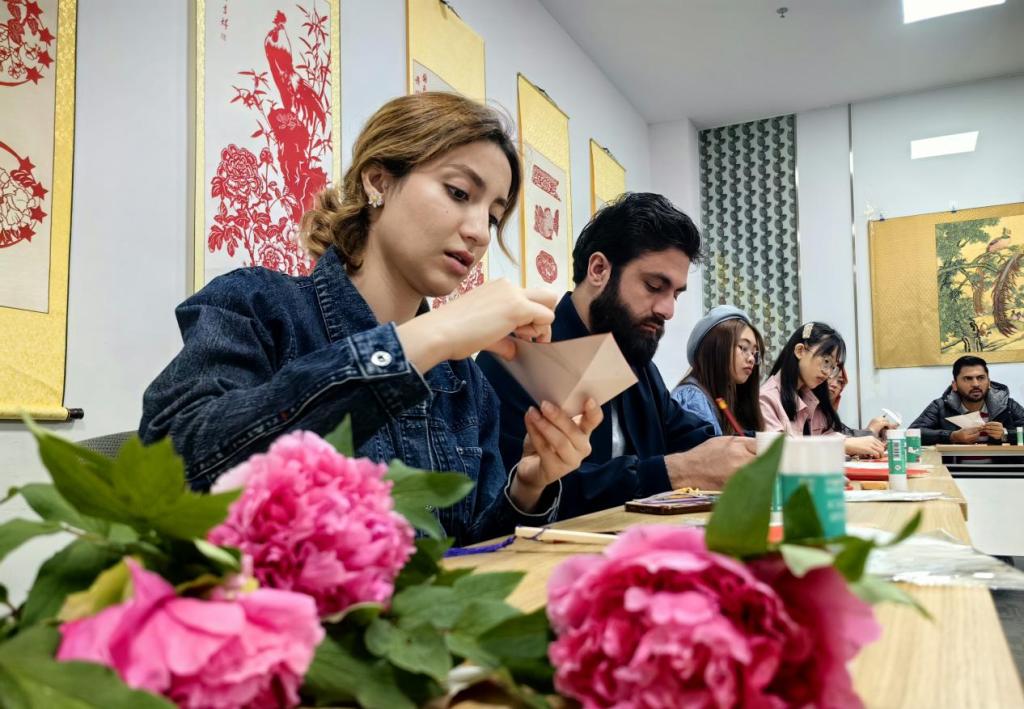4月13日上午,国际学生首先参观了菏泽职业学院非遗传承馆,通过现场观摩和动手体验,深入了解了剪纸、泥塑、木雕等非遗技艺的制作流程与艺术内涵,切身感受到非遗文化的独特韵味。随后前往尧舜牡丹产业基地,了解牡丹深加工产品的研发情况和牡丹全产业链的建设模式。