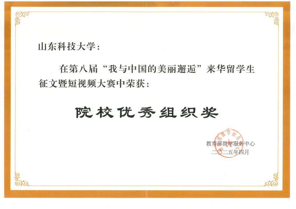 近日,由教育部国际合作与交流司指导、教育部留学服务中心主办的2025年“我与中国的美丽邂逅”来华留学生征文暨短视频大赛结果公布。我校萨尔瓦多籍学生缇娜(GIRON BARAHONA BRENDA TATIANA)的作品《邂逅中国,遇见美好》和塔吉克斯坦籍学生吴芃(AVAZOV NASIMJON)的作品《我眼中的中国》获短视频组特色奖,国际交流学院于滢源获“优秀指导教师”奖,山东科技大学获“优秀组织奖”。