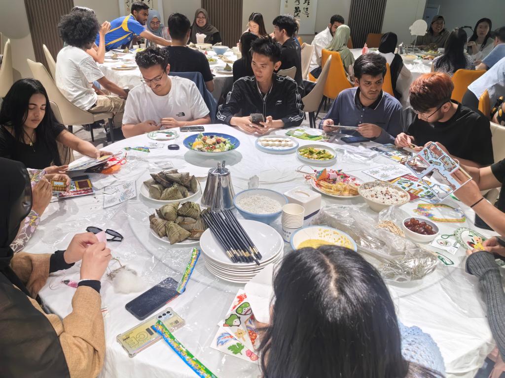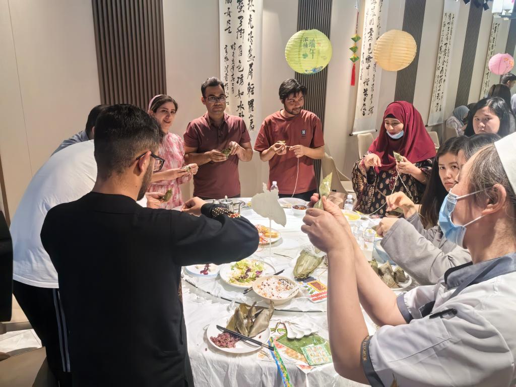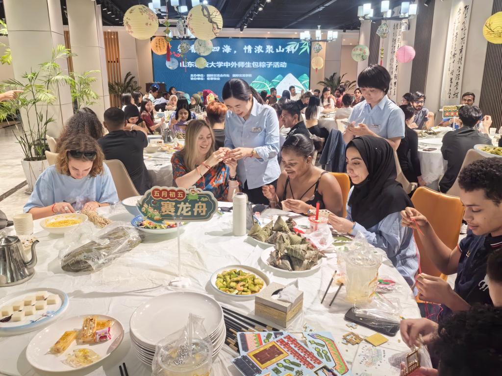 5月31日,山东科技大学国际交流学院和宏泰物业共同举办“粽香飘四海,情浓聚山科”端午节特别活动。来自美国、印度尼西亚、摩洛哥等20余个国家的八十余名国际师生与中国师生一道,沉浸式体验端午民俗,共叙跨国情谊。