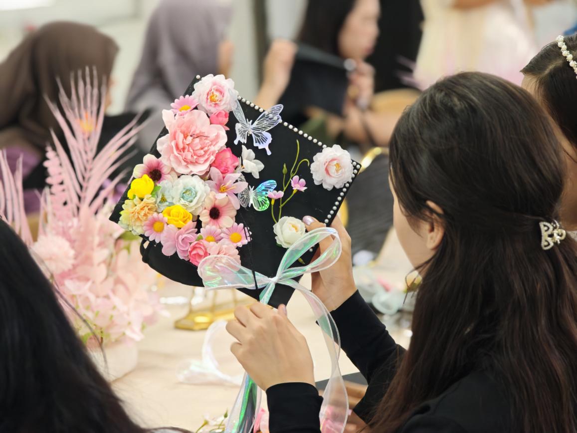 本次活动将簪花艺术与毕业学士帽进行创意结合,在传播中华优秀传统文化的同时,促进了现代中外多元审美交流,为国际毕业生们留下了深刻的记忆。