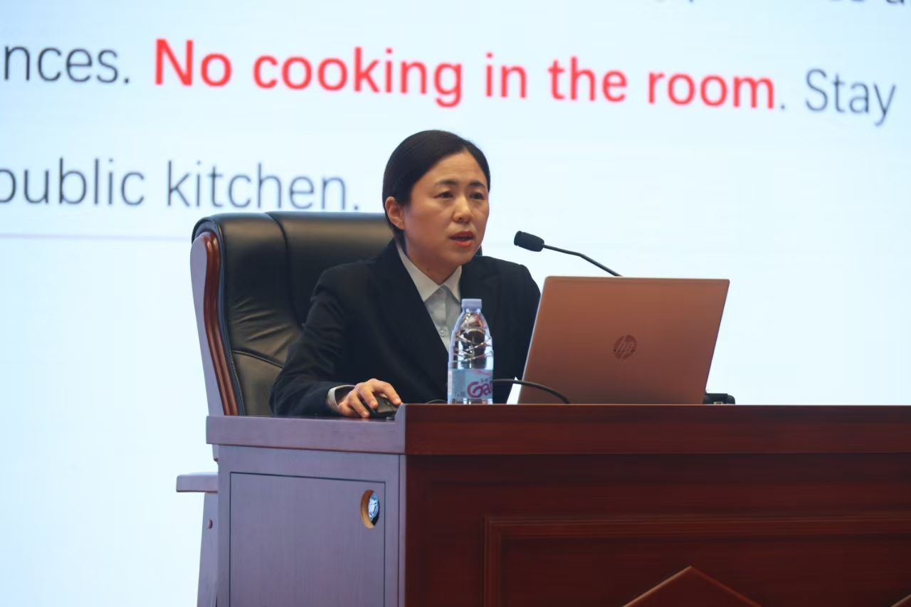 丹田物业国际学生公寓主管刘权对国际学生公寓管理做有关说明,重点强调消防安全、人身安全,进一步提高宿舍管理针对性与实效性。