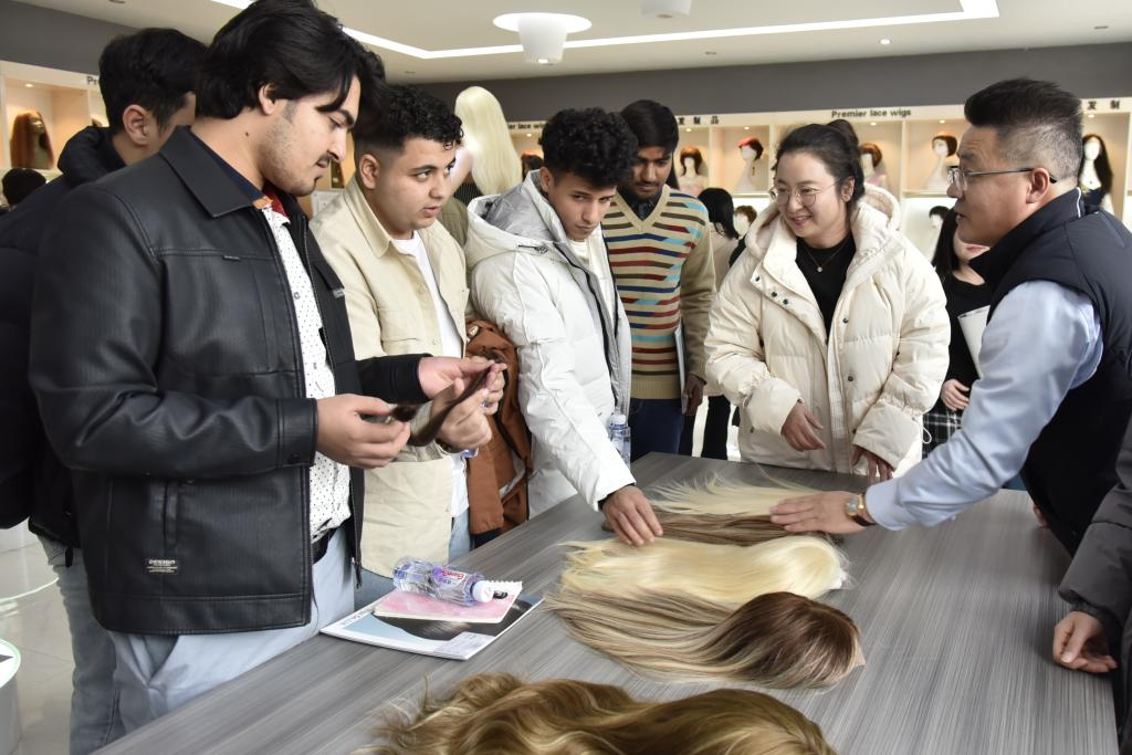 国际学生们走进胶州市领先的发制品企业——青岛冠发发制品有限公司,全面了解从发制品的原材料选择到成品制作,再到直播销售、出口海外的全流程。在技术人员的指导下,学生们亲手参与假发制作,通过“一挑一穿一钩”的精细操作,体会发制品加工的复杂与精妙。活动结束后,吉尔吉斯斯坦籍国际学生安吉拉表示:“吉尔吉斯斯坦的电商领域正是一片创业蓝海,也一直是我毕业后想要关注的领域。今天的体验让我增长了见识、开阔了眼界,希望能把先进的电商经验带回家乡。”