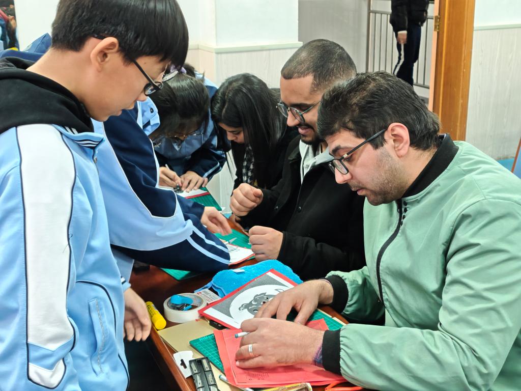 随后,青大市北附中的教师向同学们介绍了剪纸、版画和书法这三项艺术形式的历史文化背景及创作过程。在老师的悉心指导下,国际学生与青大市北附中的同学们边体验边交流,现场欢声笑语不断。在剪纸环节,附中的同学们与国际学生通力合作,遇到困难棘手的地方,同学们就手把手教国际学生剪刀或者刻刀的使用技巧,国际学生凭借对中华文化的喜欢和热情,迅速掌握了剪纸基本技巧,中外学生共同制作出一幅幅栩栩如生的作品。在书法环节,附中的同学们个个都是小书法家,在“小先生”们的指导下,国际学生很快学会了简单的起笔、运笔、收笔等技巧,并大胆尝试书写了“福”、“春”等寓意喜庆吉祥的字。尽管他们的字迹初显稚嫩,但每个人的眼中都闪烁着对中国书法艺术的热爱。版画环节则让国际学生进一步感受到了中国传统艺术的独特魅力。在老师的指导下,中外学生了解了版画的制作过程,并纷纷尝试亲手制作自己喜欢的版画图案,经过精刻细凿、选色染板、按压拓印,一幅幅精美的版画便制作完成了。这些活动不仅让国际学生们亲身感受到了中华文化的独特韵味与深厚积淀,更激发了他们对中华文化的浓厚兴趣与热爱。