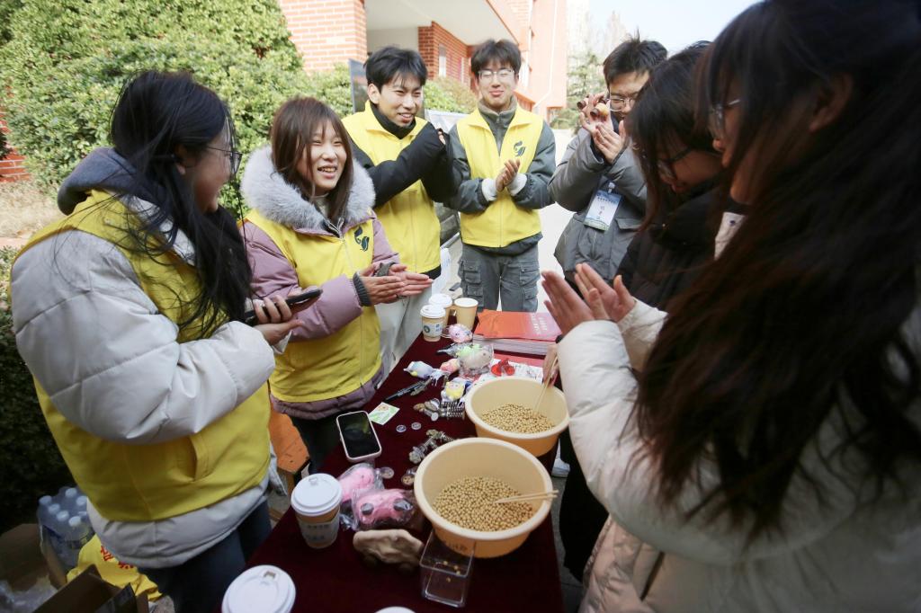 活动前期,学院学生会工作人员在考研自习室门前张贴了精心设计的祝福对联,“落笔生花,此战必捷”的字句凝结着真挚的期许,让温暖伴随晨光融入备考的每一天。活动现场,“巧夹金豆”环节引导考研学子在20秒内用筷子夹取金豆,既考验专注与定力,也以“静心耕耘,终有所获”呼应研途坚持,参与者还可凭夹取数量兑换减压礼品,在互动中舒缓紧张情绪。最后,学院为每位考研学子送上印有“愿此程终抵理想岸”的定制录取通知书,将“成功上岸”的祝愿转化为一份可触可感的鼓励,为冲刺阶段的学子注入坚定前行的力量。