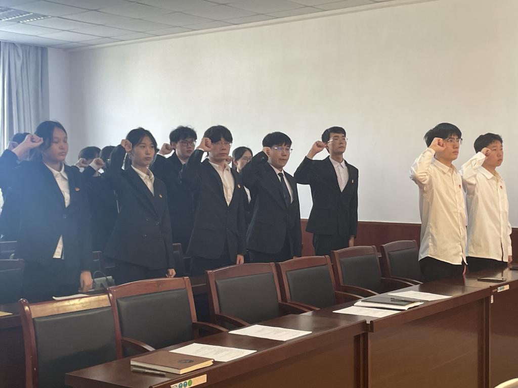 仪式在庄严的国歌声中拉开帷幕。李翊尘带领全体新发展团员学习《团章》核心内容,明确共青团员的政治责任与时代使命。张娜宣读新发展团员名单,27名青年学子正式加入中国共产主义青年团。王建友为新发展团员颁发团员证,张娜、冷冬阳共同为其佩戴团徽。徽章闪耀胸前,新团员们以昂扬的精神面貌,完成了这场政治身份转变。
