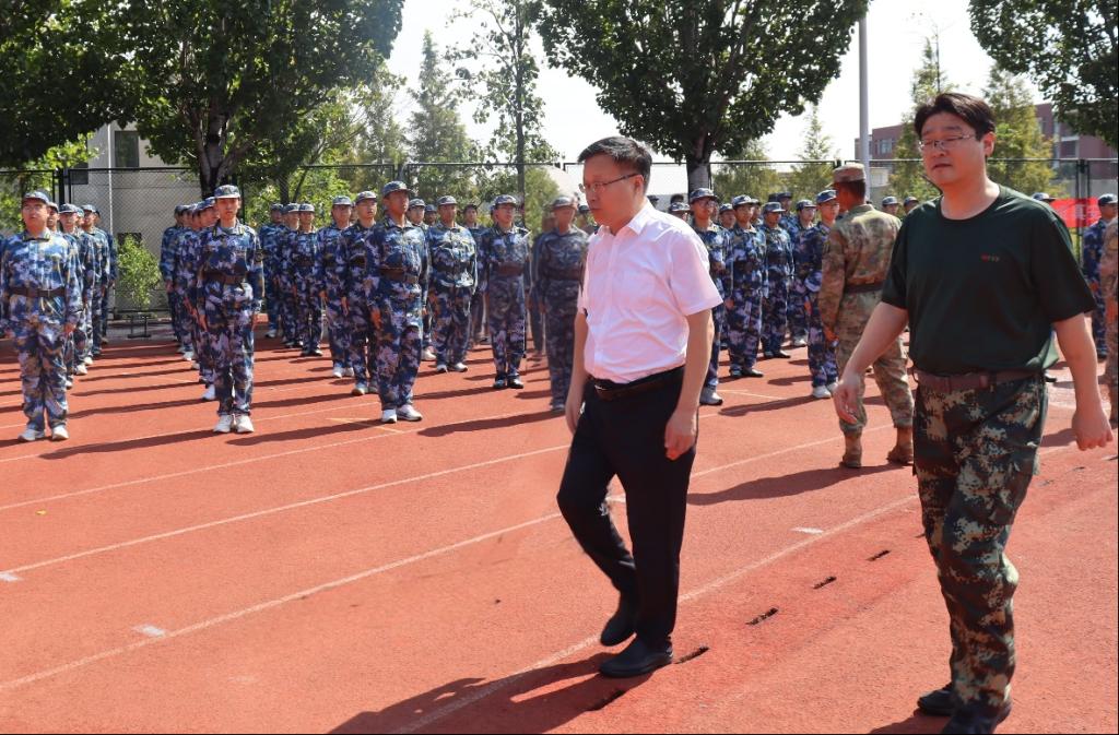 9月16日上午,安全学院2025级本科生新生在高地操场列队集结,步履铿锵、斗志昂扬。校党委书记王君松带队亲临军训现场指导检查工作,党委办公室(学校办公室)主任董桂刚、学生工作处(部)处(部)长尹立明陪同视察。