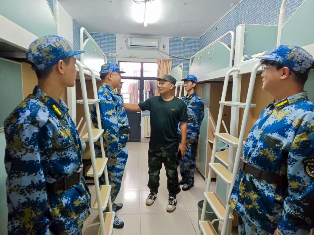 训练场上雷厉风行的教官,在宿舍里化身细节控。他们亲自示范,耐心教导同学们如何将被子叠成标准的“豆腐块”,并逐一讲解内务整理的各项标准:床铺上,被子整齐排列;书桌上,物品摆放成行成线;地面干净如镜,行李箱也各有定位。刘雨池细致检查了每个宿舍的内务情况,对表现优秀的宿舍予以肯定,对存在不足的宿舍则指出问题并指导改正。