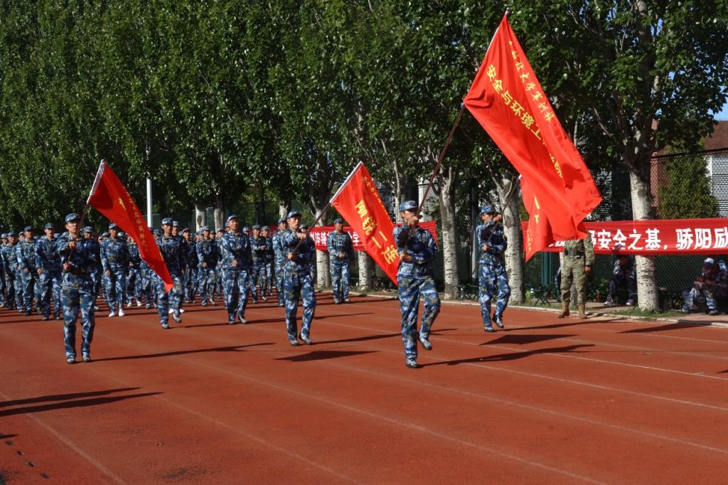 训练场上,教官嘹亮的一声"正步——走!"口令划破长空,新生们瞬间昂首挺胸,如同一座座挺拔的青松,迈出整齐划一的步伐。秋日的骄阳炙烤着大地,汗水顺着脸颊滑落,浸透了衣衫,但他们目光如炬,训练的热情丝毫未减。每一次摆臂,手肘绷直,高度平齐,在空中划出一道道标准的直线;每一次踢腿,膝盖绷紧,步调一致,脚掌落地时发出整齐划一的"嗒嗒"声响彻整个操场。