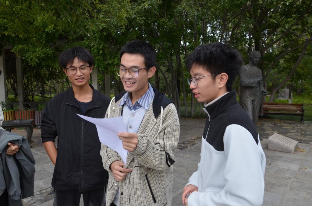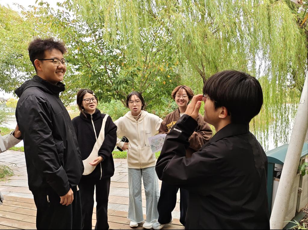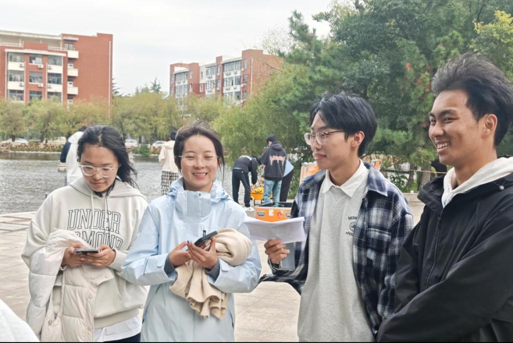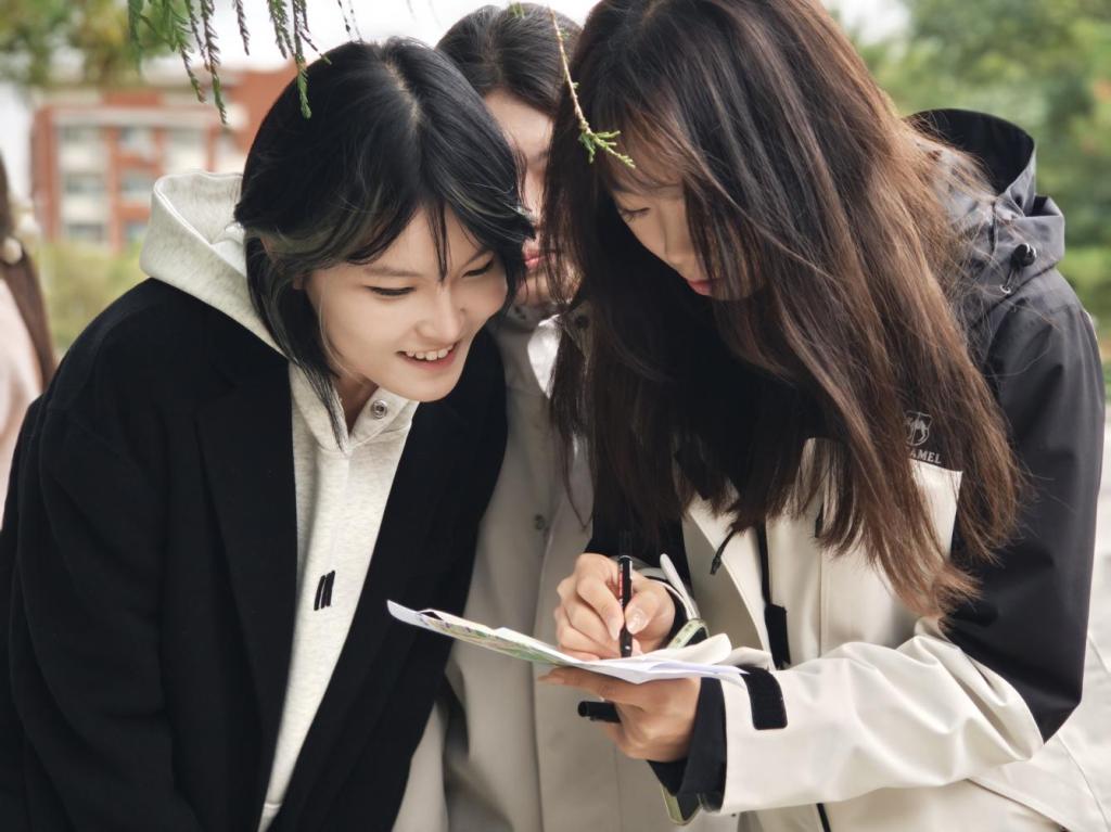 赛事精心规划打卡路线,串联起繁星广场、小西湖、泰山广场、励志坊、若水园等多个校园景点作为任务节点。各参赛队伍依照地图指引,依次完成“猜歌名”“你画我猜”“新绕口令”“解手链”等一系列趣味挑战,并收集红旗贴纸,最终以全程用时决出胜负。在拍照打卡环节,一张张灿烂笑脸定格于秋日校园;在“解手链”等协作任务中,同学们默契配合,在实践中深刻体会到以“团结、坚韧、担当”的精神,实现了校园文化与红色教育的深度融合。比赛过程中,队员们并肩奔跑、热烈讨论,展现出昂扬向上的青春风貌,这不仅是对体能与智慧的双重考验,更是对团队协作精神的集中锤炼。