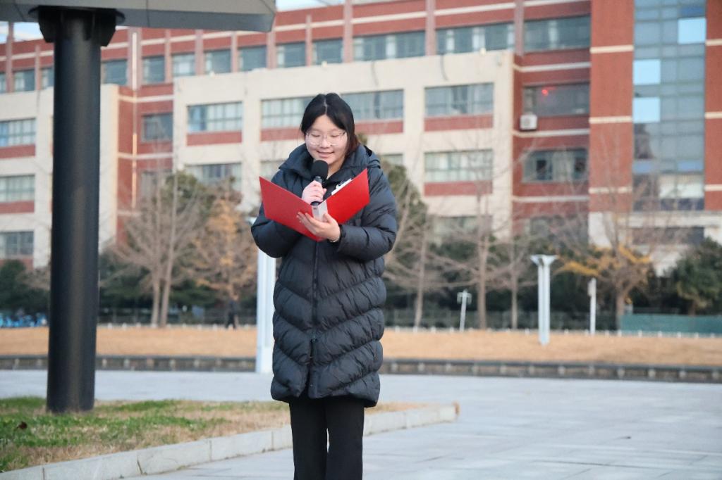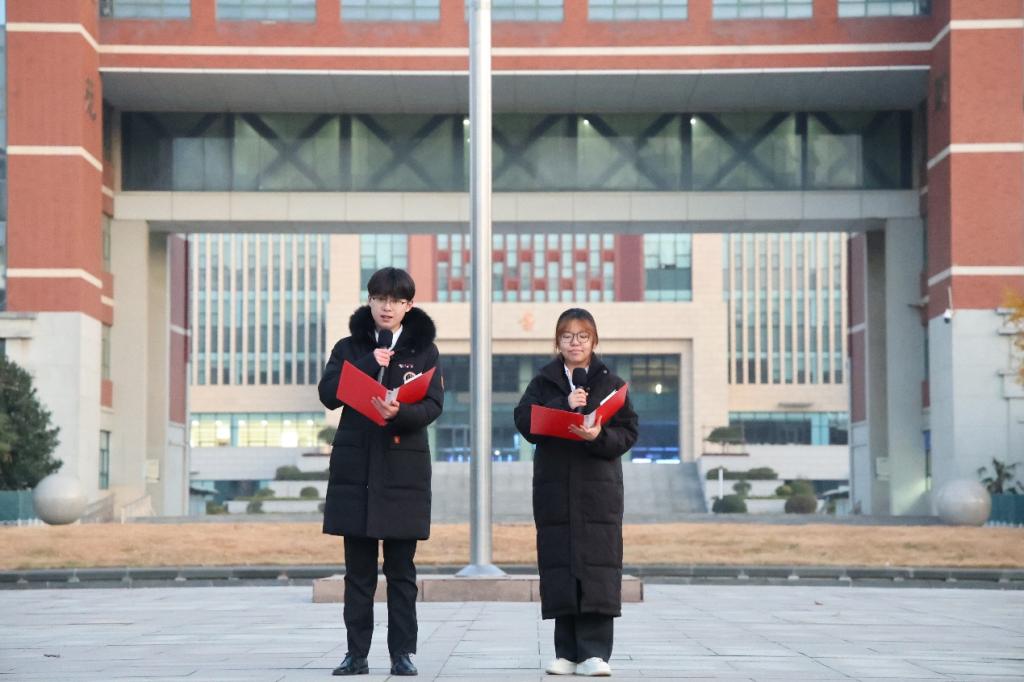 在国旗下,学生代表颜羽和李咏容共同进行《锋刃映红日,青春誓山河》主题朗诵,真切阐释了一代代青年人的赤诚与担当。回望历史,百年前,一群青年高举信仰火炬寻找民族复兴的希望;百年后,一代代青年人把青春奉献给了祖国,成为实现中华民族伟大复兴的先锋力量。今年恰逢中国人民抗日战争暨世界反法西斯战争胜利八十周年,天安门前盛大的阅兵式向世界展现了中国的大国底气与磅礴力量。最后全体师生庄严宣誓“以青春之我,传承百年信仰;以我之青春,创造盛世辉煌”,展现了当代青年复兴中华的坚定决心。