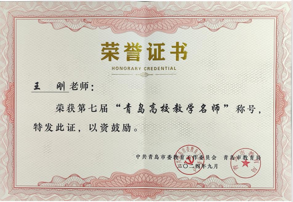近日,中共青岛市委教育工作委员会、青岛市教育局公布第七届青岛高校教学名师授奖名单,我院王刚教授获“第七届青岛高校教学名师”荣誉称号。