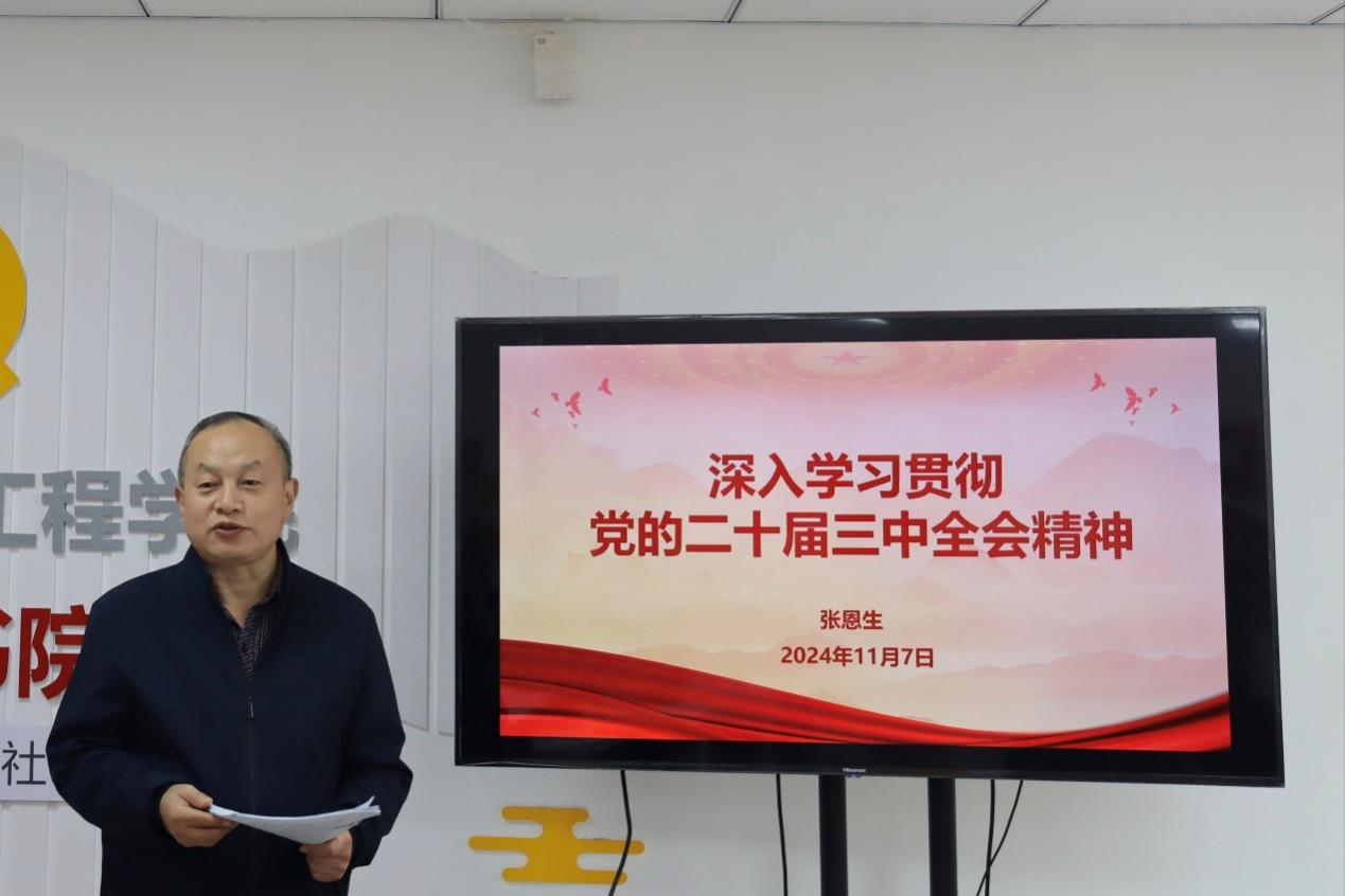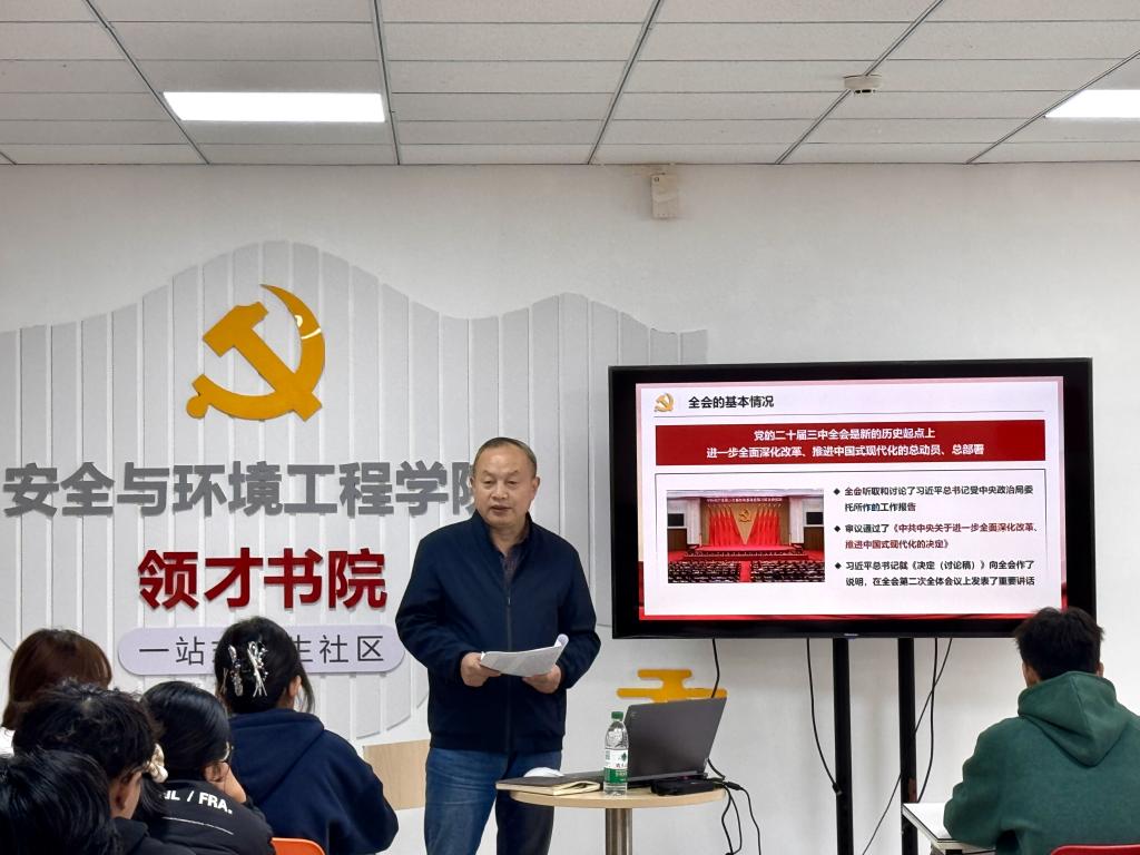 为深入学习贯彻党的二十届三中全会精神,切实增强同学们的政治责任感和历史使命感,11月7日,安全学院党委书记张恩生于GC4“一站式”学生社区-“领才书院”为联系班级学生作党的二十届三中全会精神宣讲报告。
