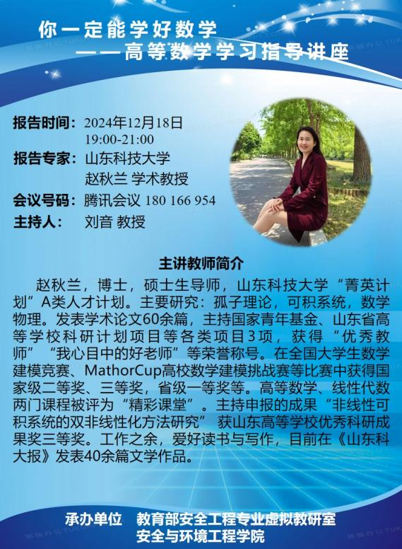 临近期末考试,为提升2024级新生高等数学学习技巧,顺利通过高等数学期末考试,2024年12月18日,安全学院协同教育部安全工程虚拟教研室举办高数学习线上讲座。讲座由赵秋兰教授主讲,刘音副院长主持,旨在激发学生对高等数学的学习兴趣,提升学习能力,帮助学生在高等数学学习上取得更好的成绩。赵秋兰教授凭借丰富的教学经验和学术成就,为学生提供了宝贵的学习策略。