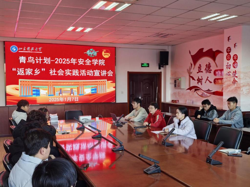 为引导青年学生深入田间地头、助力基层治理,进一步做好山东科技大学安全学院本科招生工作,1月7日,安全学院于J9-223举办“青鸟计划”2025年“返家乡”社会实践活动宣讲会。安全学院副院长刘音、团委书记张娜出席此次会议,会议邀请2022级环境工程专业学生张乐天做宣讲经验分享,广大安全学子积极参与,会议由辅导员李翊尘主持。