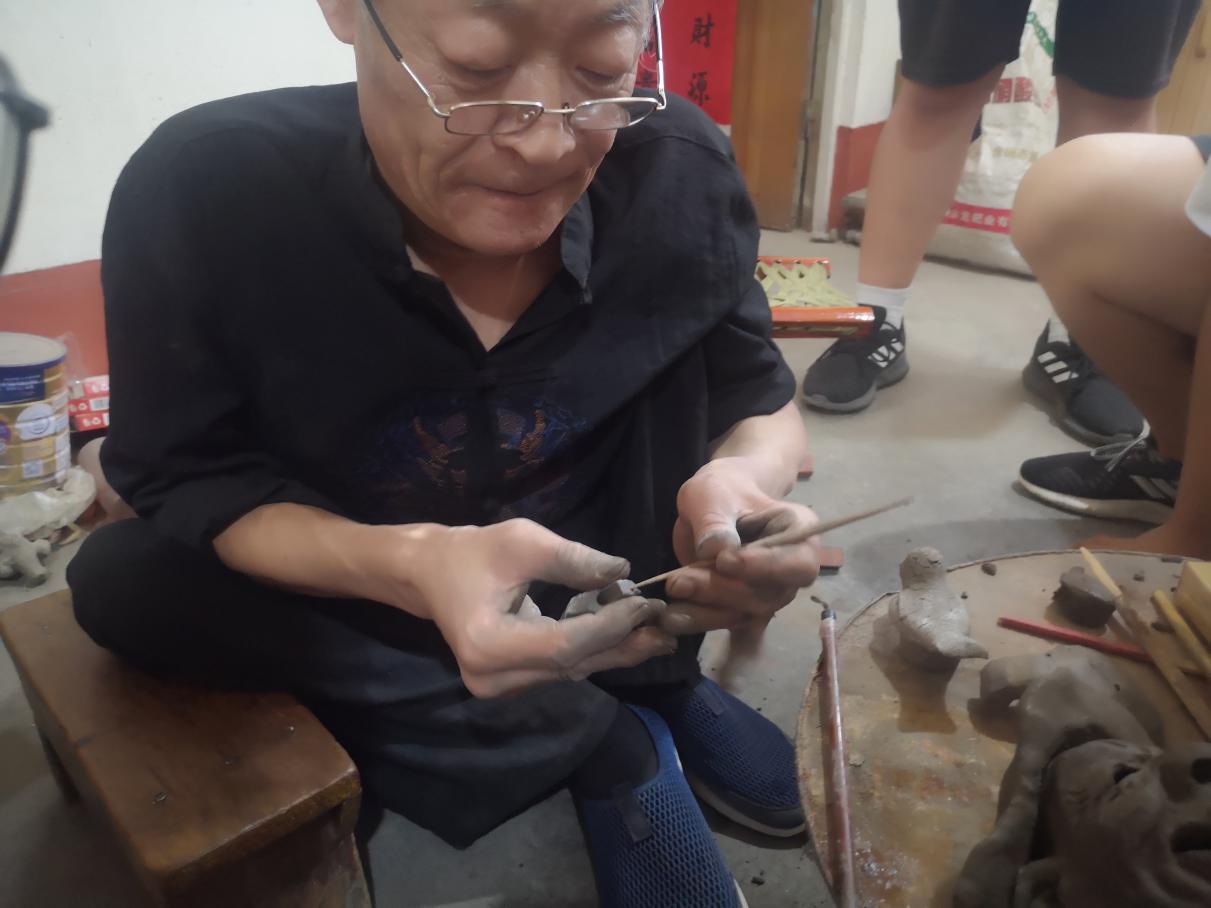 下午,团队再次返回荆师傅家,围绕泥塑的传承发展问题与荆师傅进行了详细的访谈。访谈中,团队了解到泥塑目前的发展很大程度上受经济因素影响。要发展泥塑产业,首先要解决传承人的吃饭问题。这给团队提出的产业化发展提供了宝贵的指导思路。荆师傅还跟队员们分享道,“小时候,我跟着我爷爷学习捏泥塑,爷爷嫌我捏的人像歪歪扭扭,一生气就给我摔了。”无意间分享的过往故事,却无不流露出荆师傅对那段学习泥塑时光的怀念与难忘。