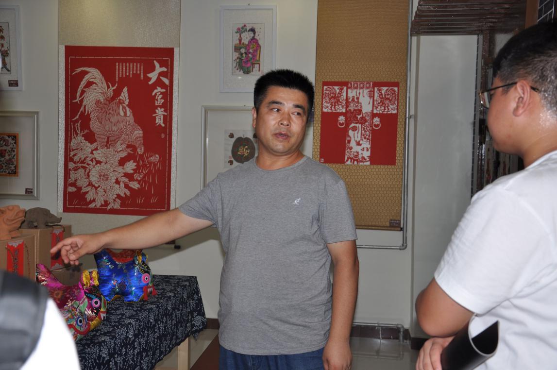 临行前,团队提前联系到平度市艺术家协会会长高杰老师和当地非物质文化传承人荆宝海师傅,对第一天的行程做了初步规划。调研团队清晨出发,经过三个小时车程后到达目的地平度市,下车后随即赶往非遗展馆。高杰老师热情地引导团队并介绍了陈列在展馆内的艺术作品,评价并展望了平度非遗文化现状及未来,队员们认真倾听并记录了高杰老师的讲解。