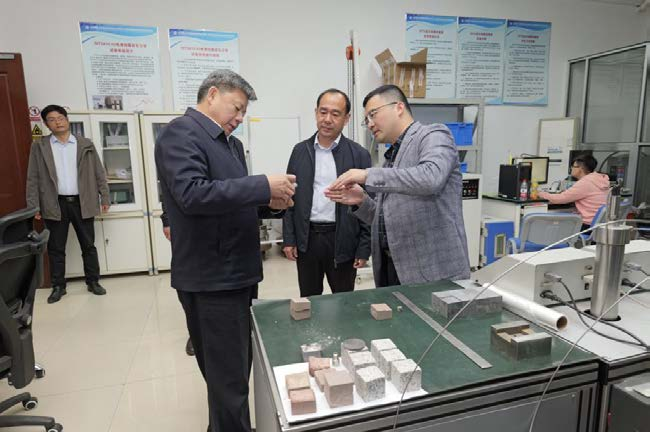 10 月 25 日,北京科技大学校长杨仁树一行在校长曾庆田的陪同下参观实验室,实验室常务副主任王刚教授讲解。参观过程中,杨仁树详细了解了实验室的发展历程、研究方向和近年来取得科研成绩,并表示在矿业研究与开发领域,两校实验室可以加强合作,就矿业领域重大科学问题合力攻关。
