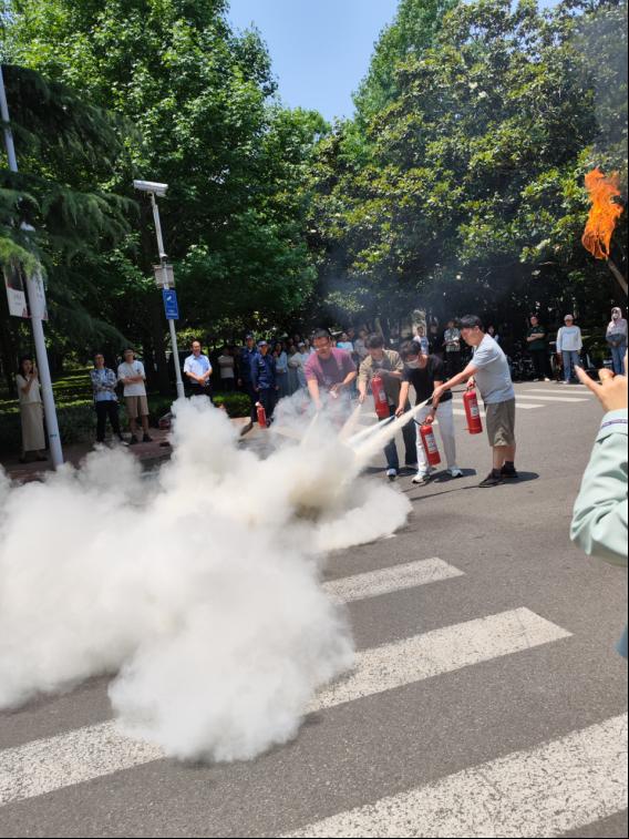 演练模拟金属锂引燃着火场景,重点检验了危化品火灾应急处置、伤员急救、临近实验室疏散,以及实验人员、实验室负责人、学院负责人三级预案的执行与联动协调能力。整个流程严格遵循事件发生、前期自救、事件报告、应急响应、疏散、现场封锁、人员清点、事件续报等环节有序进行,并对各步骤进行了同步解说。随后,进行了灭火器的使用培训和实操练习。在保卫处消防专员的指导下,参训师生分组进行了干粉灭火器和二氧化碳灭火器的实操训练,确保关键时刻“会用、敢用、能用”。